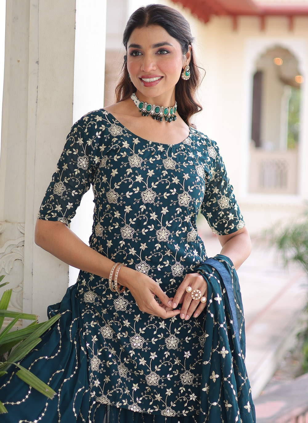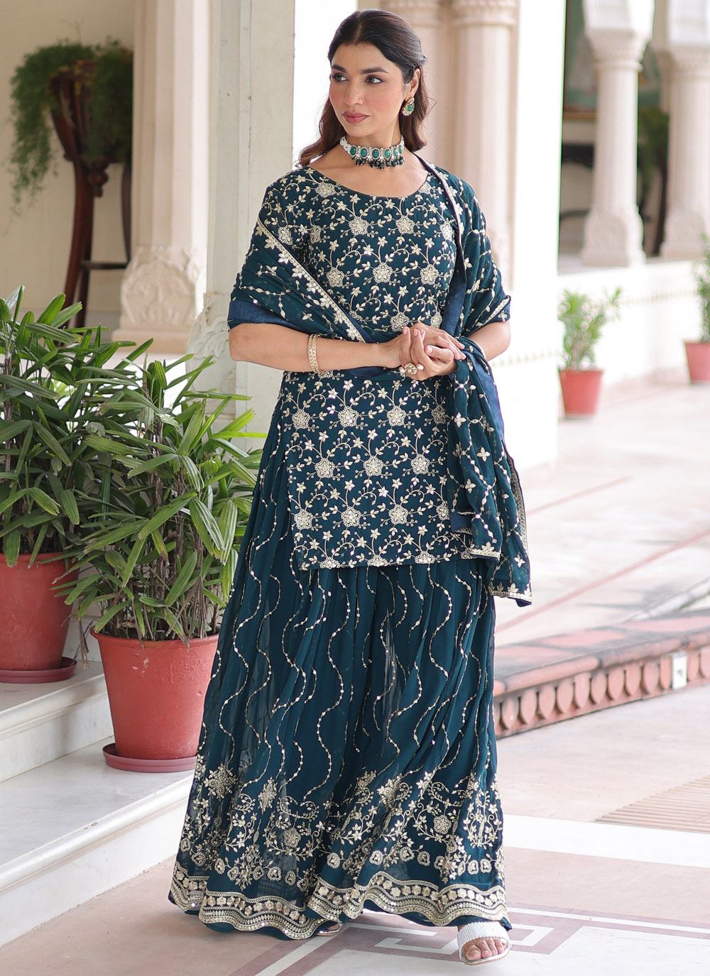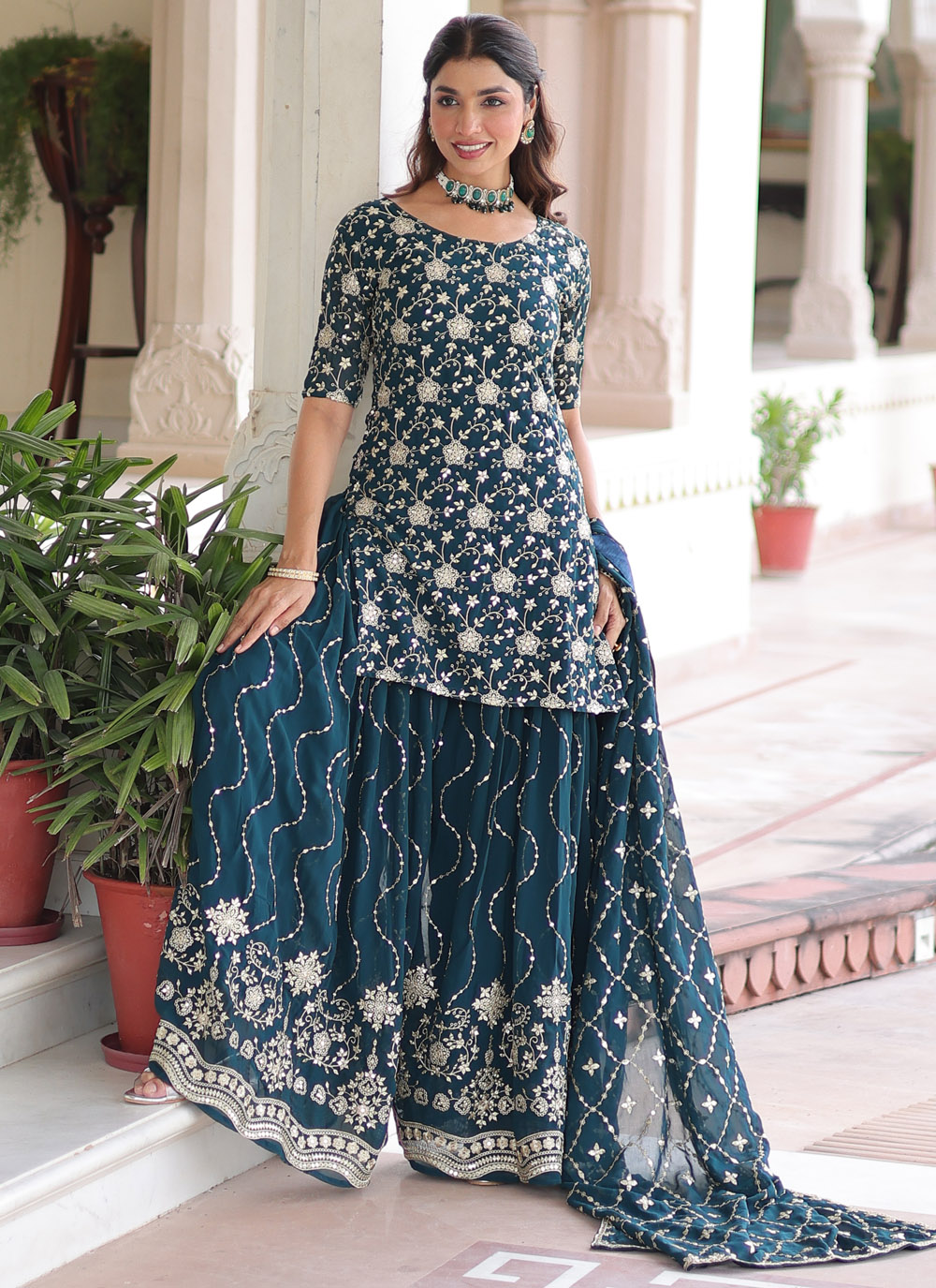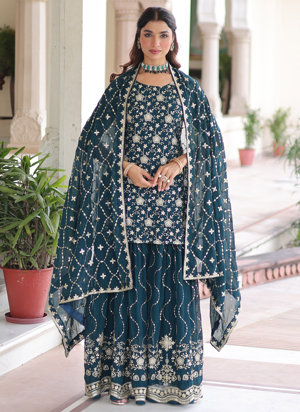 Celebrate in style with this charming Rama faux georgette sharara set, adorned with beautifully detailed embroidery and subtle sequin shine. The elegant kurta pairs perfectly with a wide-flare sharara, offering both comfort and visual appeal. Comes with matching bottom and dupatta.