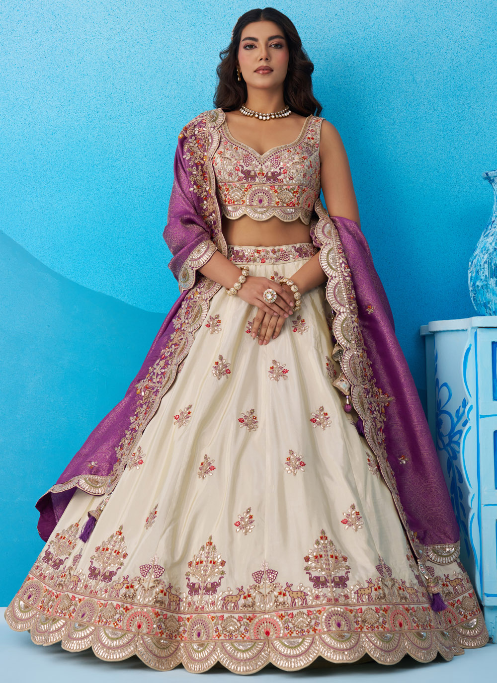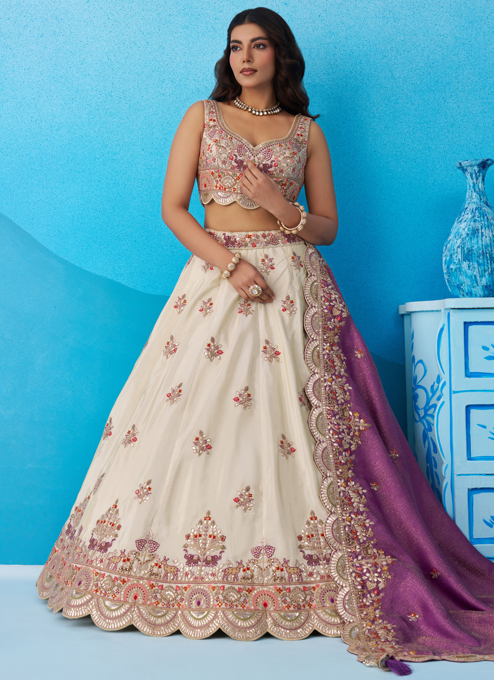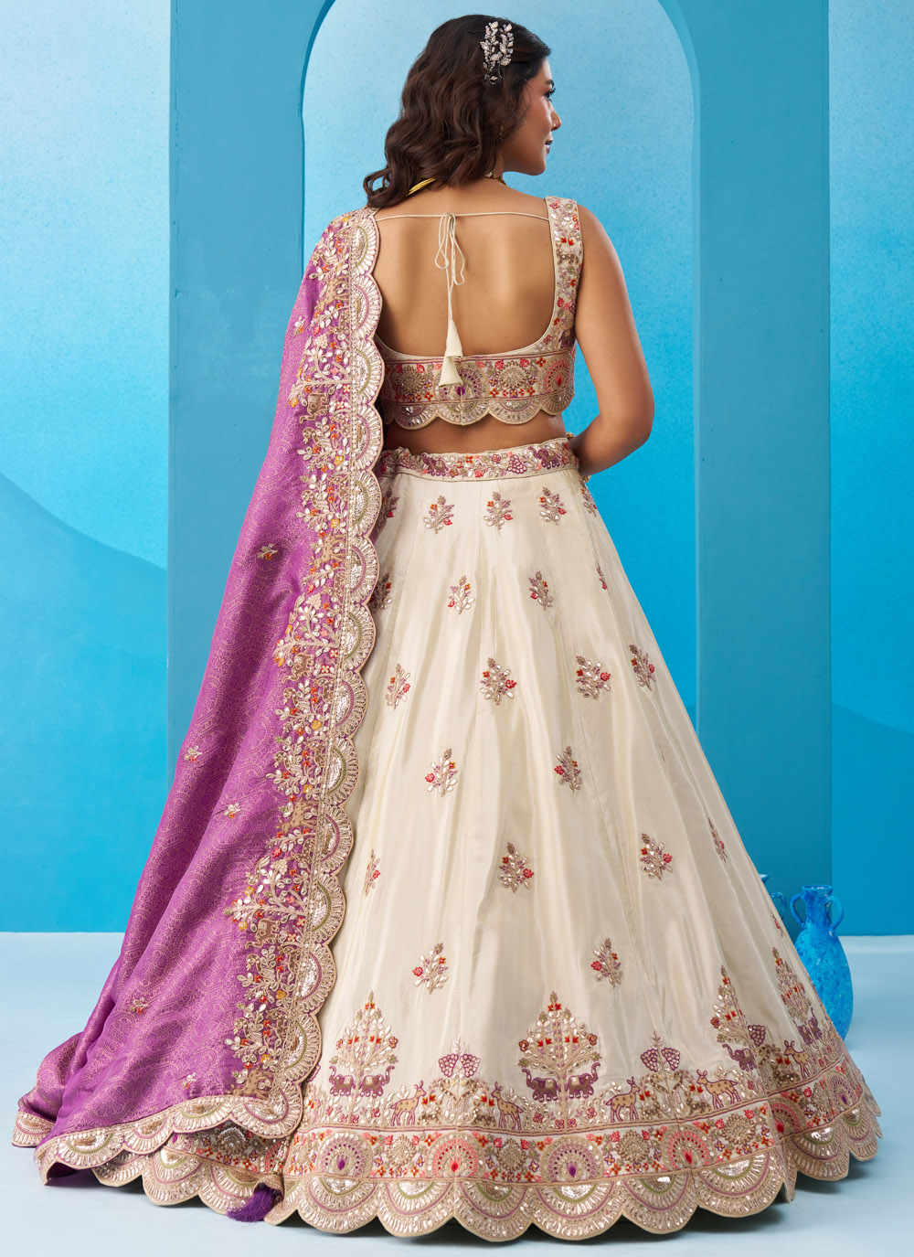 This Cream Tissue Sequins Gota Embroidered Festival Lehenga Choli beautifully reflects traditional elegance with a festive touch. Crafted from delicate tissue fabric, the lehenga features shimmering sequins and classic gota embroidery that enhances its appearance. Comes with matching choli and dupatta.