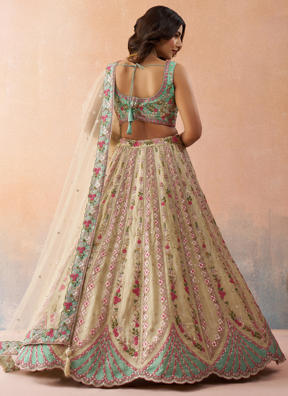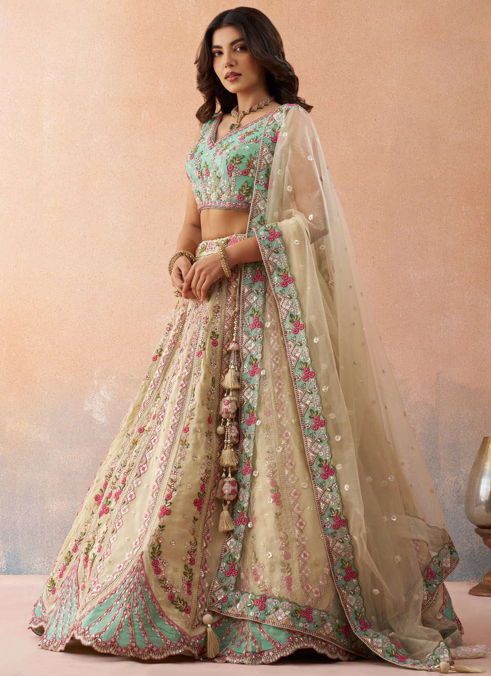 Make a graceful style statement with this Cream Tissue Sequins Stone Embroidered Lehenga Choli. Crafted with rich tissue fabric, the lehenga flows beautifully while reflecting a soft shine that enhances the overall look. Comes with matching choli and dupatta.