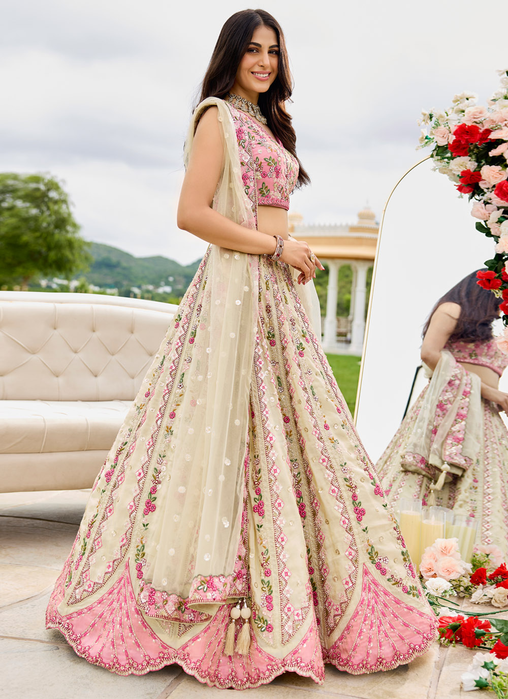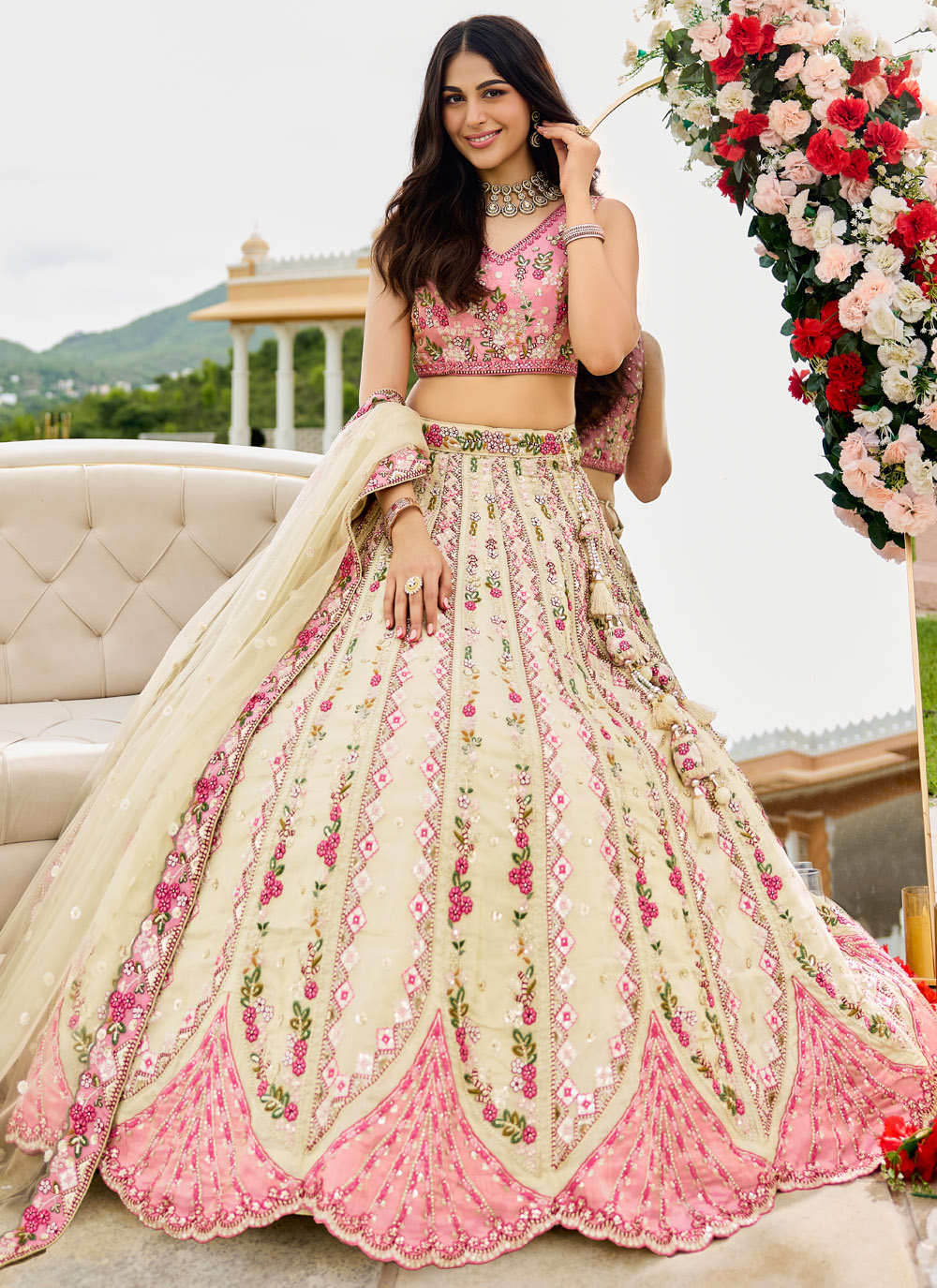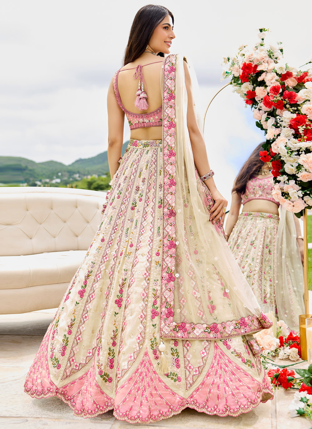 This cream tissue lehenga choli radiates elegance with intricate thread embroidery, sparkling sequins, and stone embellishments. The delicate cutwork border adds a designer touch, making it perfect for weddings, receptions or engagements. Comes with matching choli and dupatta.