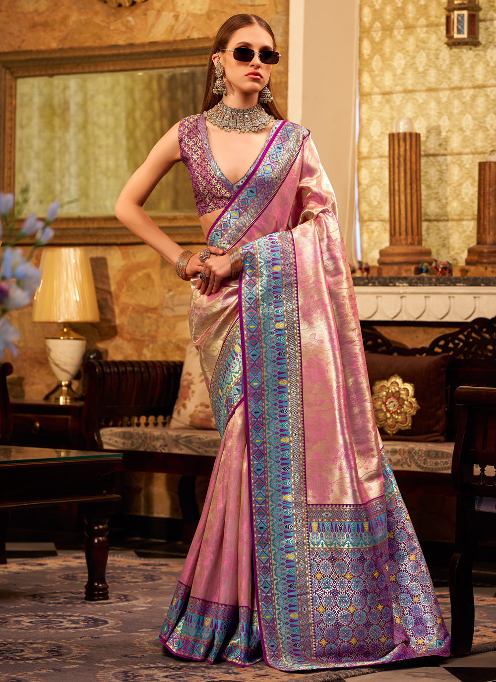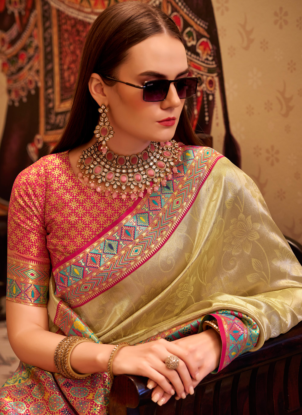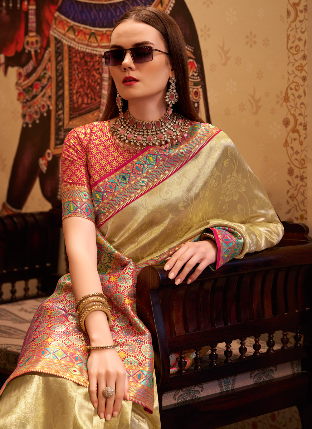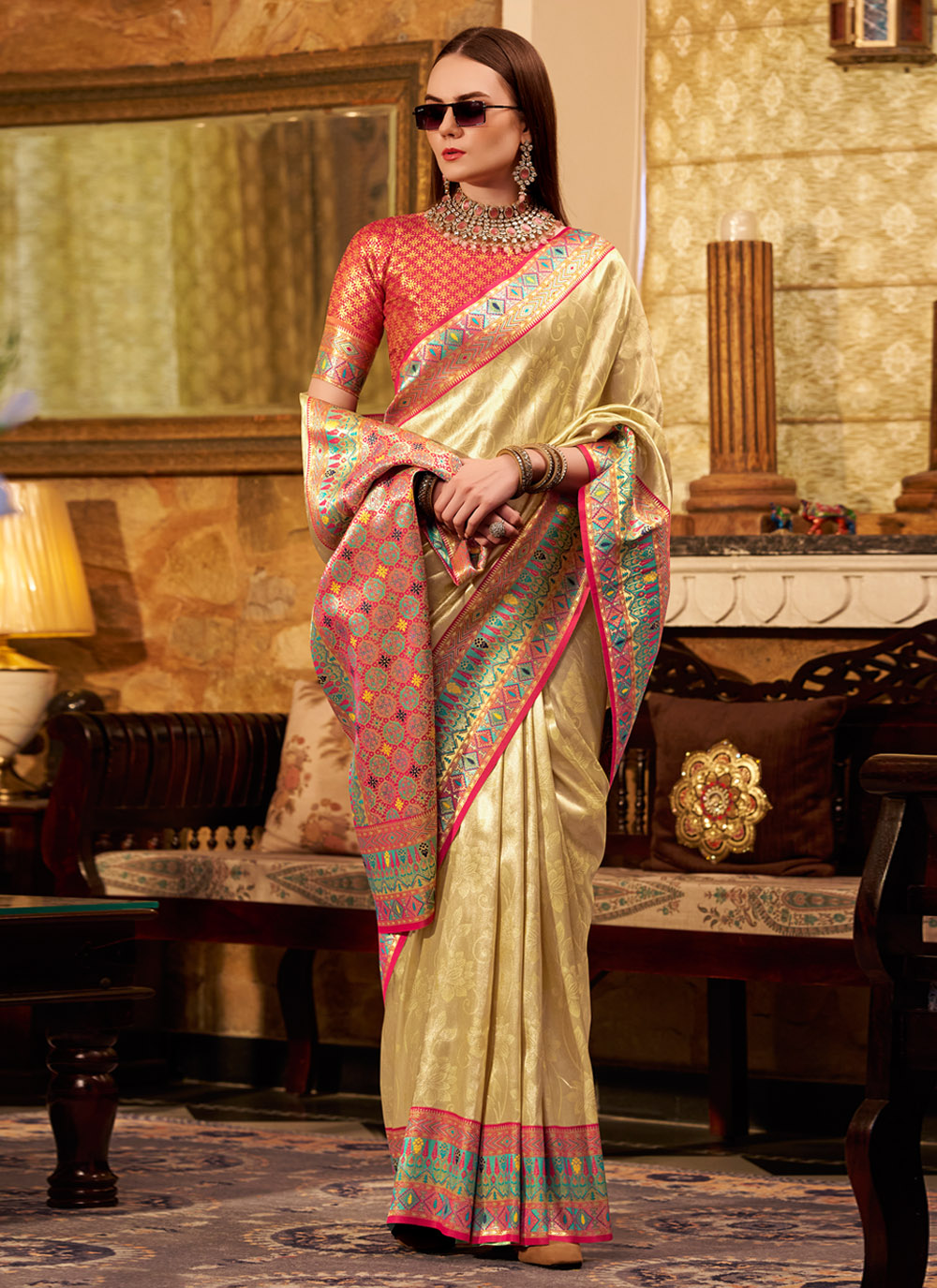 Grace meets grandeur in this cream tissue silk classic saree, delicately adorned with refined weaving work that reflects timeless beauty. The soft shimmer of tissue silk paired with elegant detailing makes it the perfect pick for weddings, religious events or sophisticated gatherings. Comes with matching blouse.