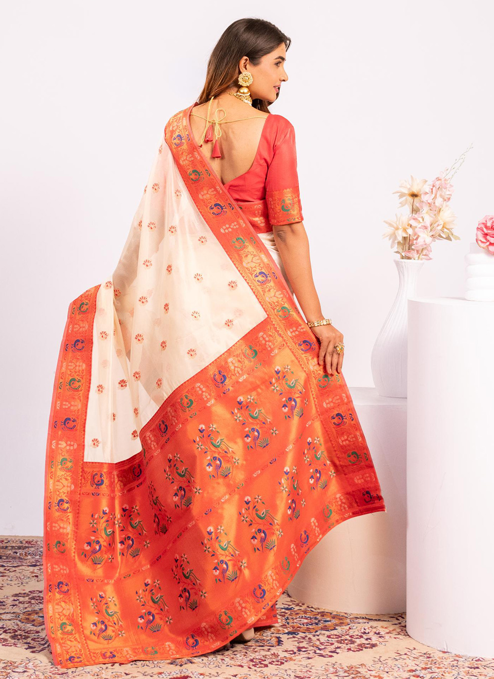 This beautifully crafted cream saree combines traditional design with modern simplicity. The zari weaving work highlights craftsmanship, while the soft tissue silk fabric offers a comfortable and graceful drape for every special occasion. Comes with matching blouse.
