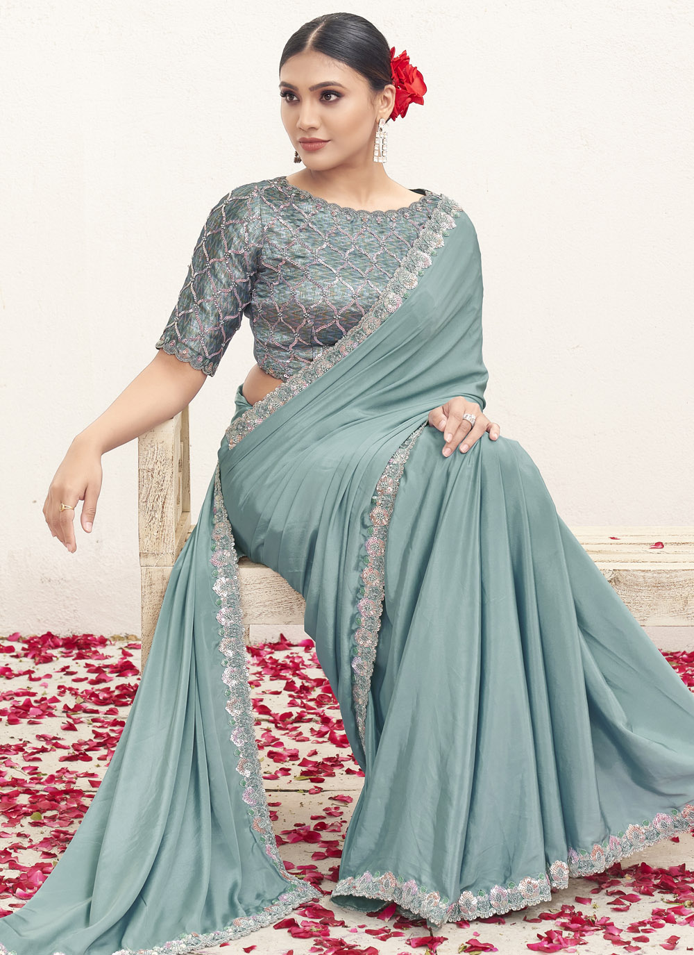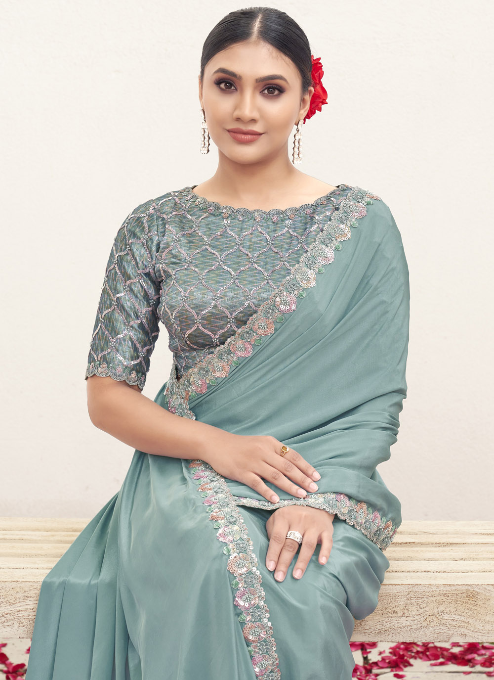 Crafted in rich crepe silk, this contemporary blue saree showcases a graceful fall and sophisticated look. The border is intricately embroidered with delicate zari and sparkling sequins, making it perfect for festive occasions, weddings, and sangeet. Comes with matching blouse.