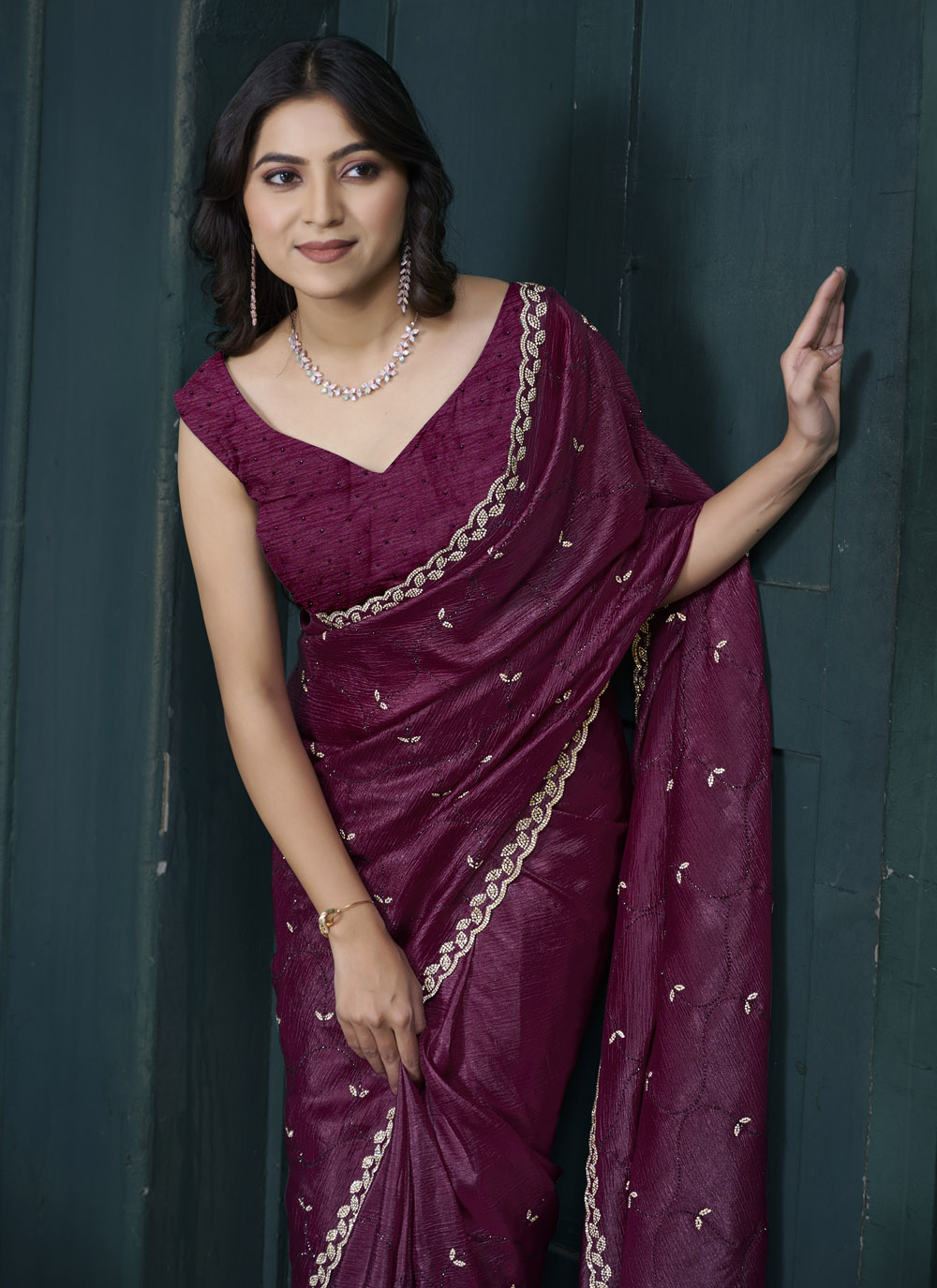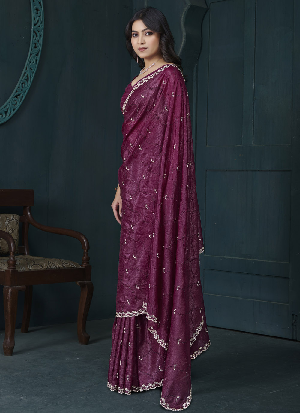 Drape yourself in timeless elegance with this Maroon Crepe Silk Saree, exquisitely adorned with intricate diamond work and refined hand embroidery. The soft sheen of crepe silk drapes beautifully, while the classic maroon hue enhances your regal charm. Ideal for weddings, traditional ceremonies, and grand occasions. Comes with matching blouse.