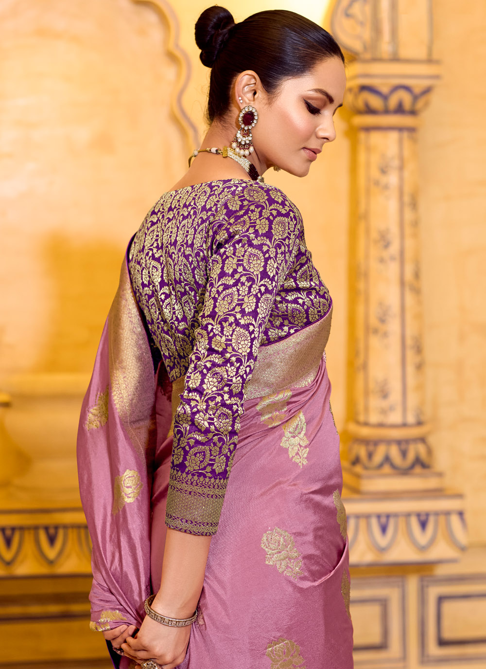 This pink crepe silk saree offers a trendy and graceful look with its beautiful zari weaving work. The smooth fabric drapes effortlessly, making it perfect for festive celebrations and special occasions. Comes with matching blouse.