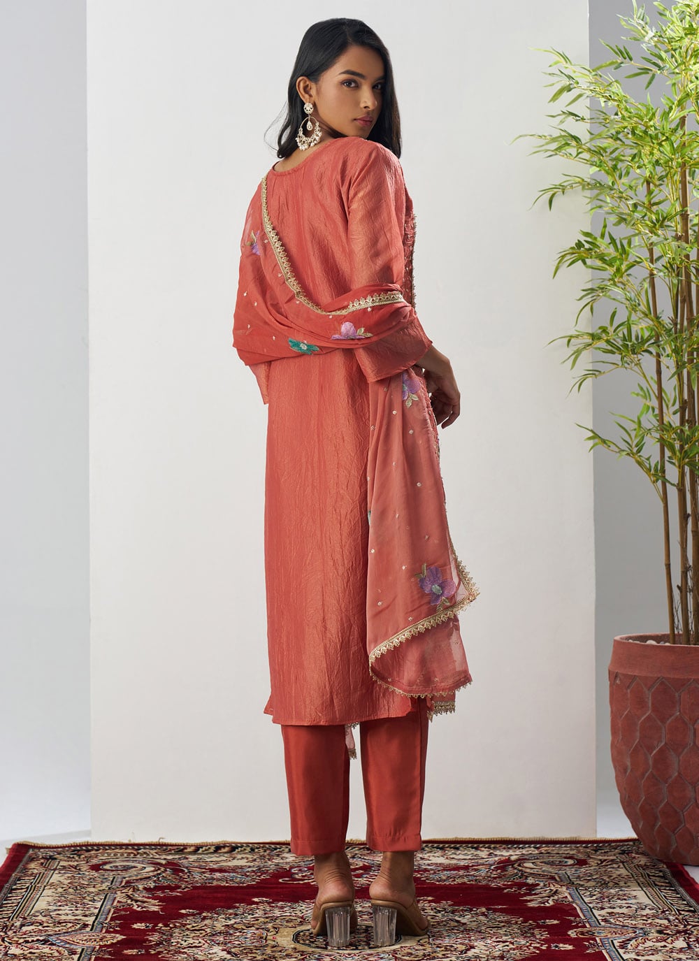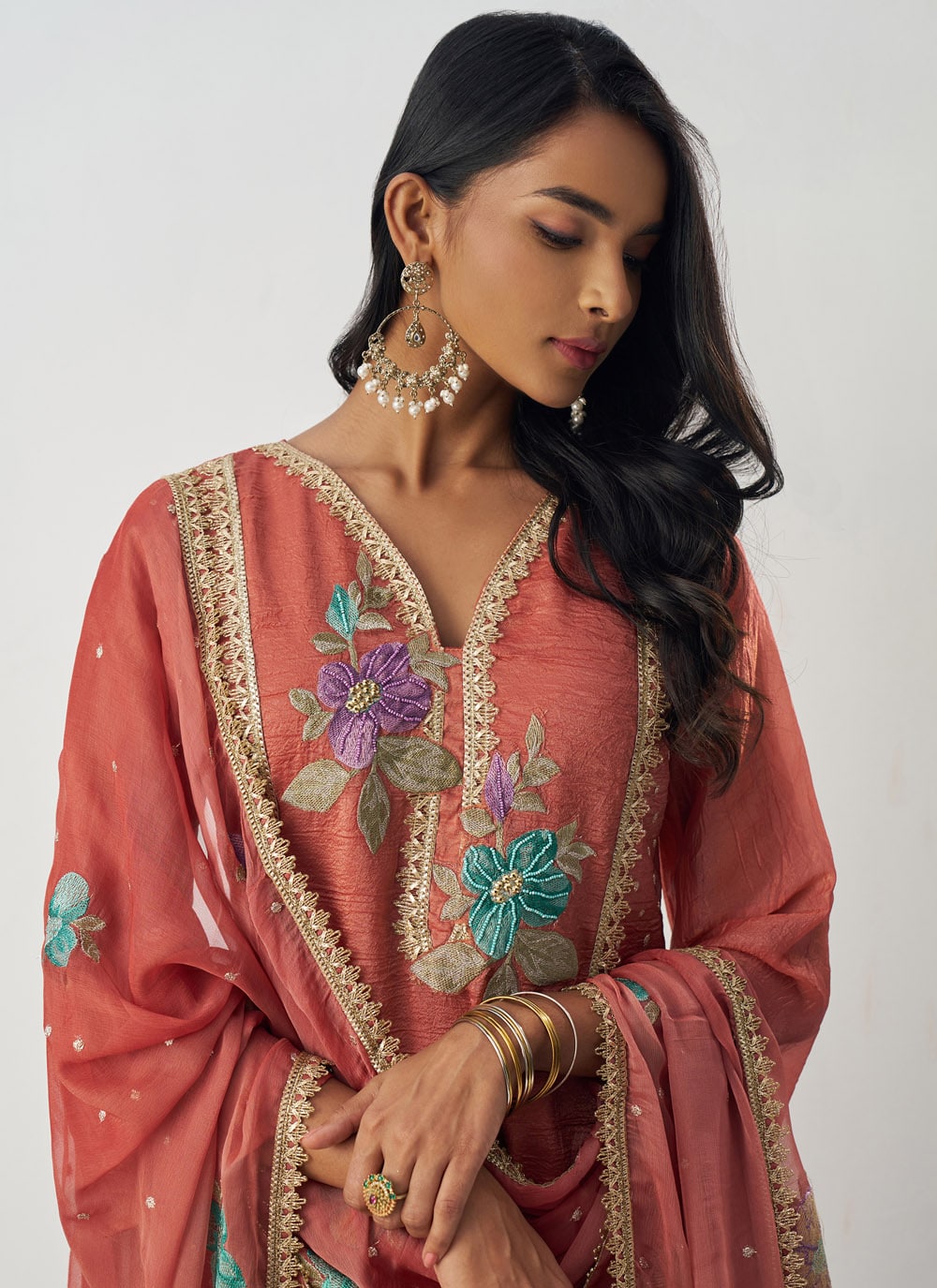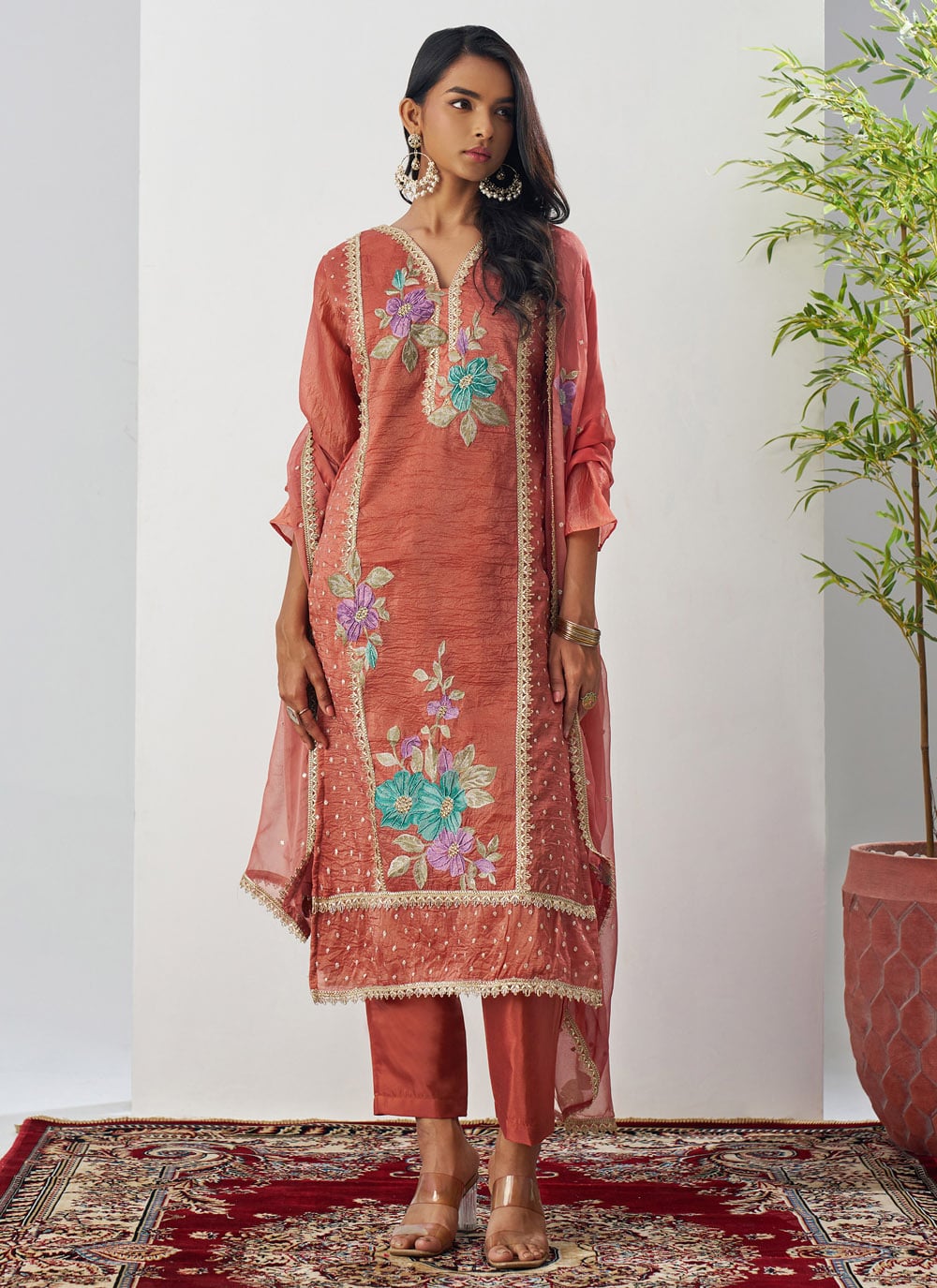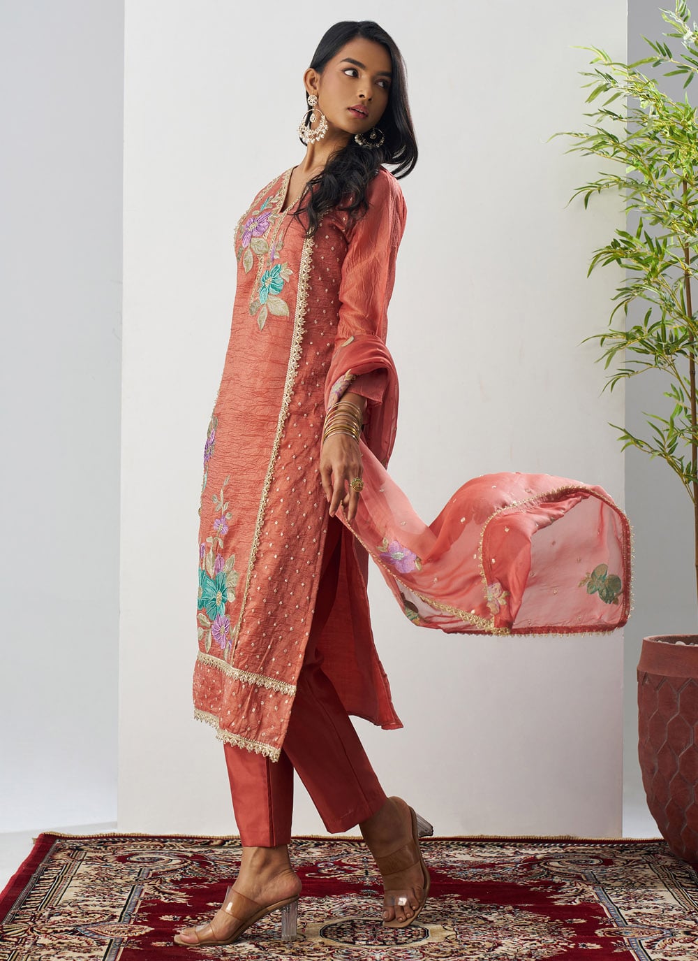 Grace meets glam in this pink and rust embroidered salwar suit made from soft crush fabric. The lightweight texture paired with detailed embroidery makes this outfit a standout choice for weddings, mehndi or festive evenings. Comes with matching bottom and dupatta.