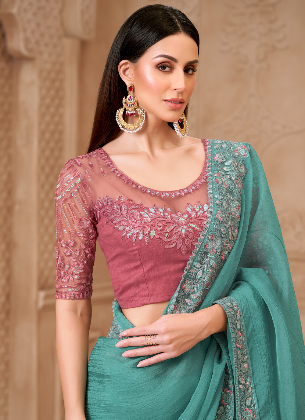 Crafted from premium crush satin georgette, this border embroidered saree offers comfort, easy drape, and a flattering silhouette. The vibrant turquoise hue and detailed embroidery add sophistication to your ethnic wardrobe. Comes with matching blouse.