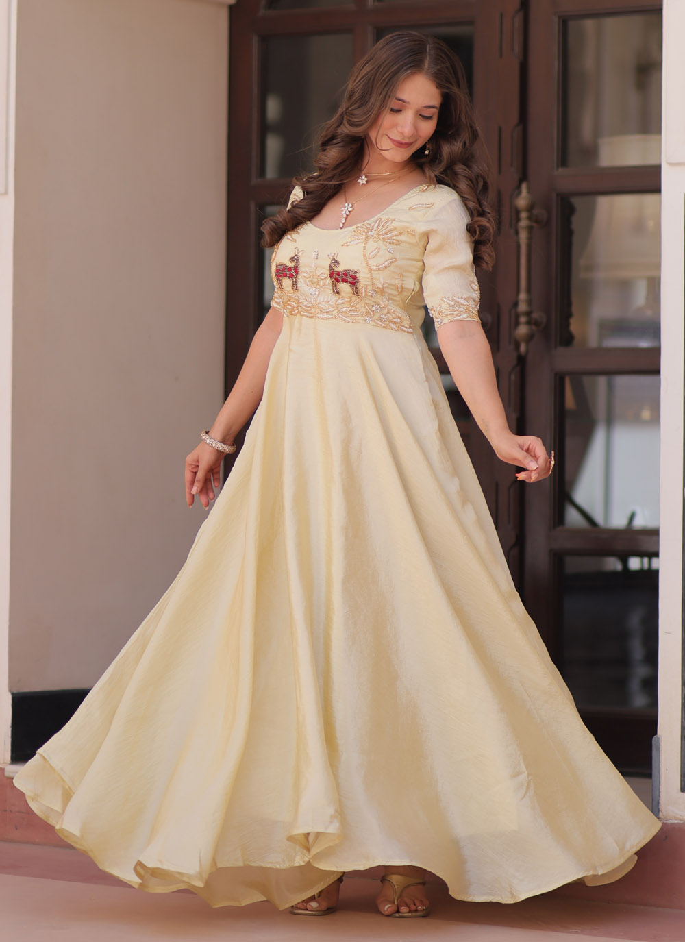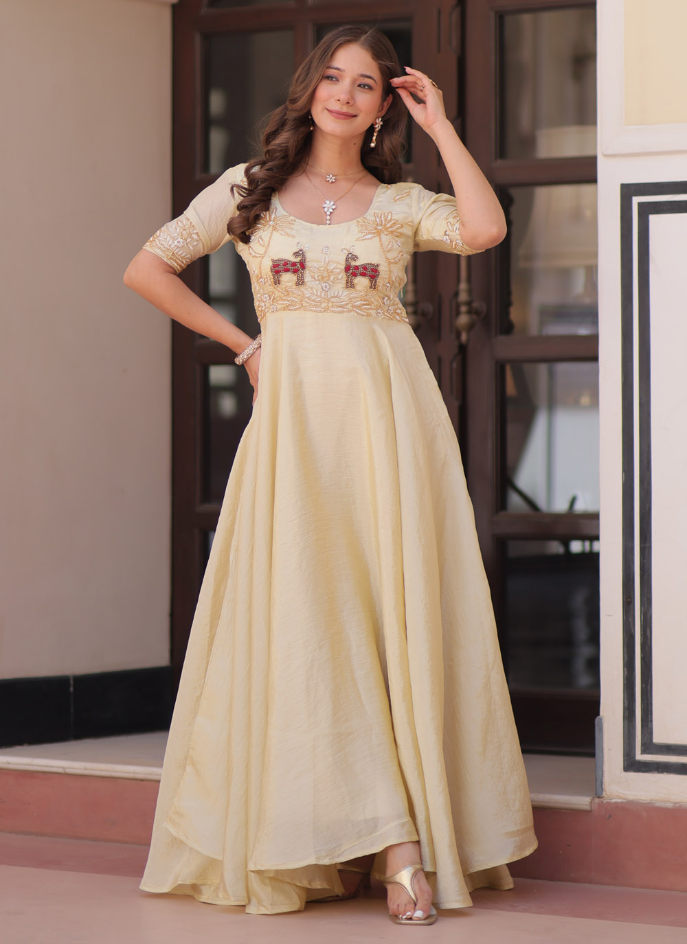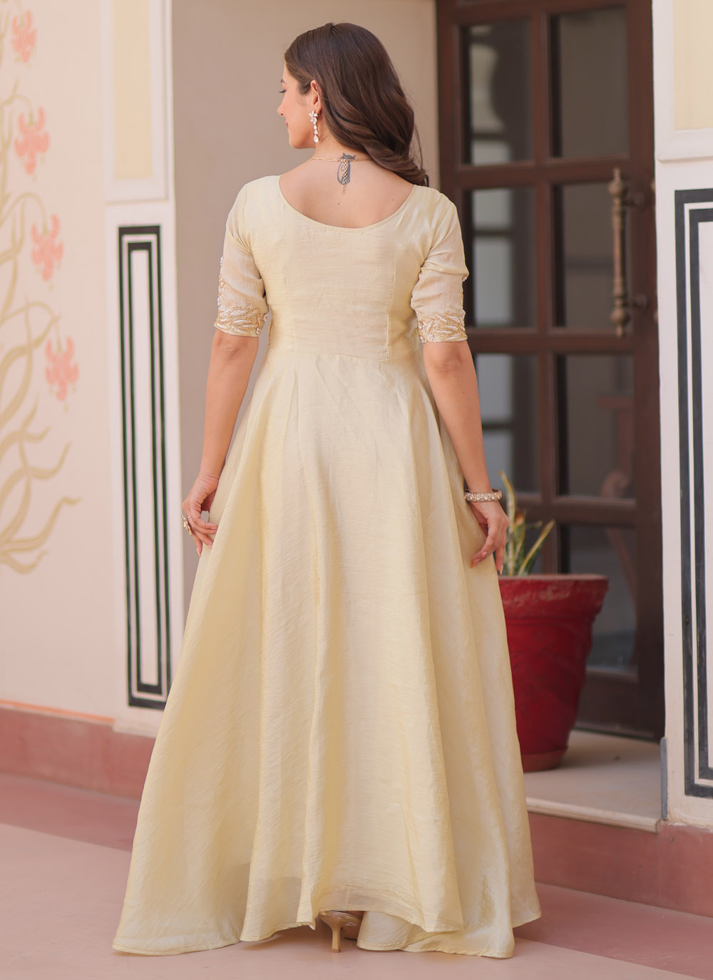 Designed for effortless elegance, this readymade gown features a chic crush texture enhanced with sequins and bead embroidery. Its off-white tone and contemporary design make it a versatile outfit for gatherings and special celebrations.