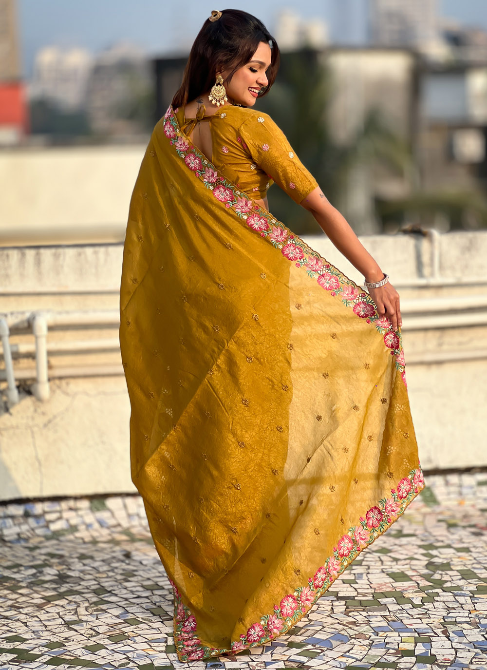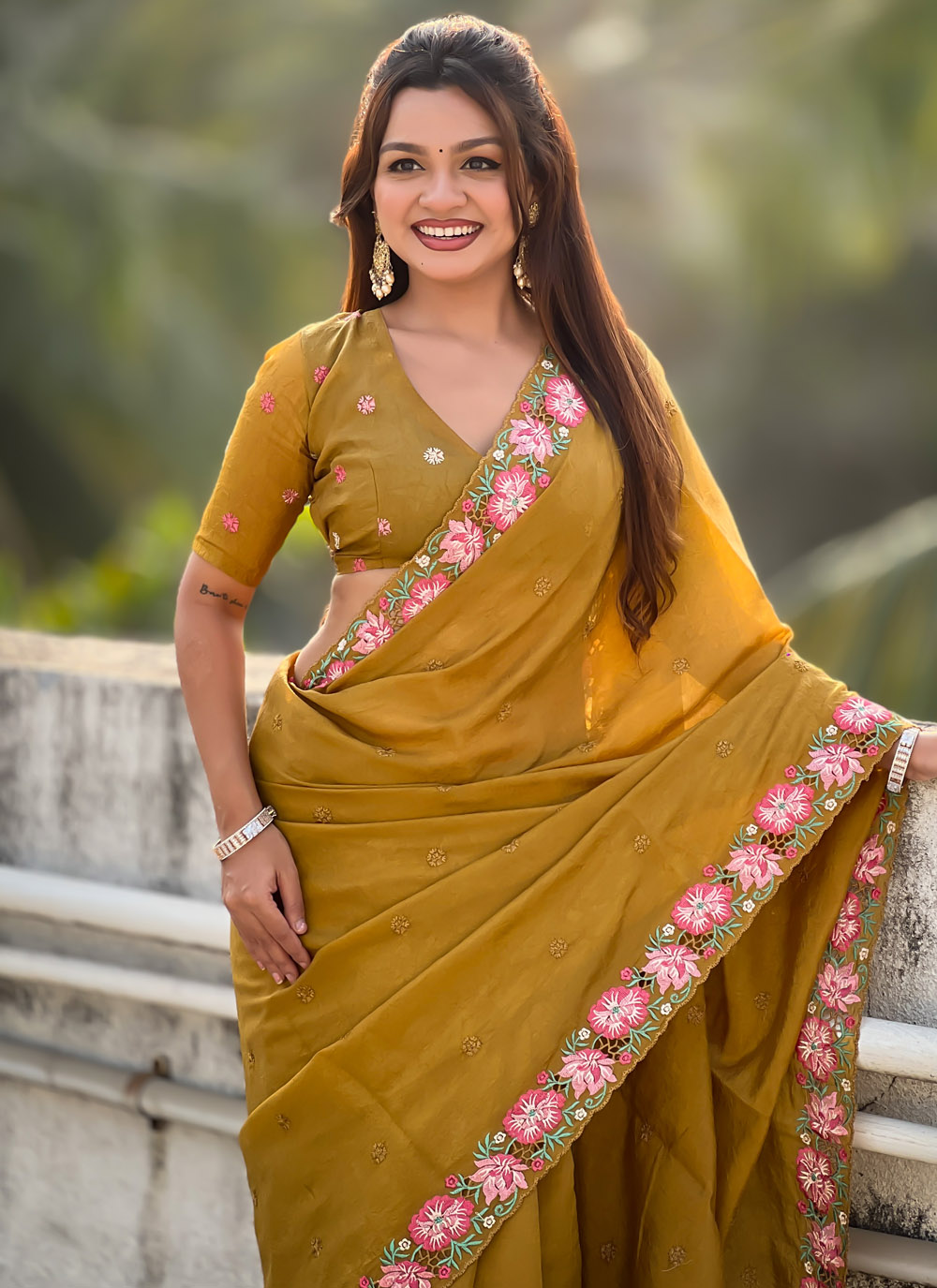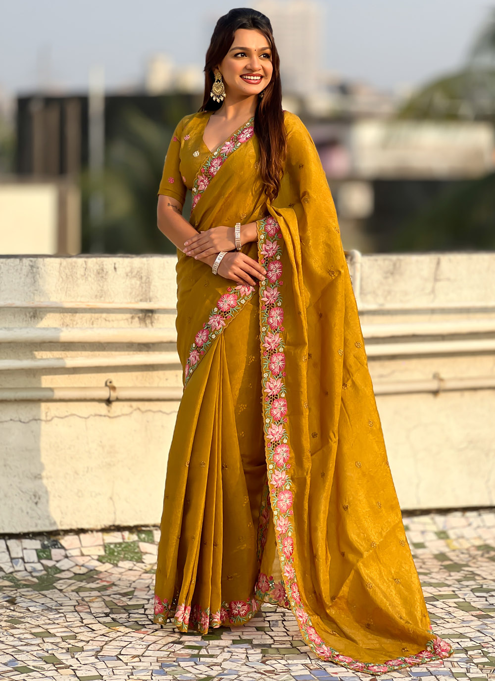 Crafted from premium crush silk, this mustard saree showcases detailed embroidered patterns enhanced with elegant cut work. Its soft drape and subtle shine create a timeless ethnic look. Comes with matching blouse.