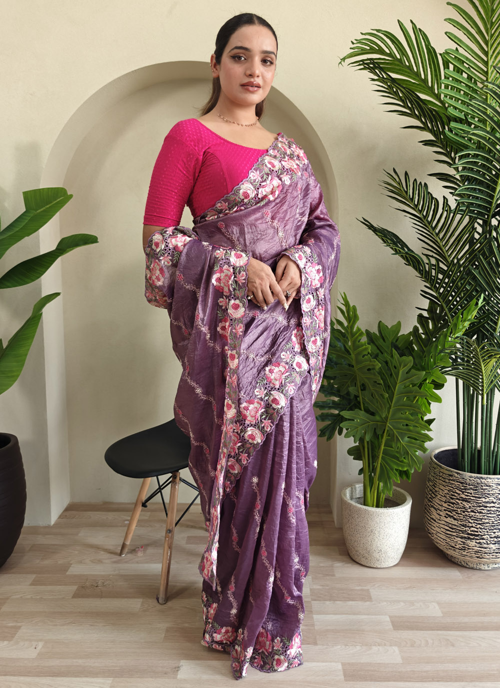 Make a statement with this Purple Cut Work & Embroidered Saree in Crush Silk, designed for the modern woman who loves ethnic fashion with a trendy touch. The rich fabric and exquisite detailing create a regal and refined look for special events. Comes with matching blouse.