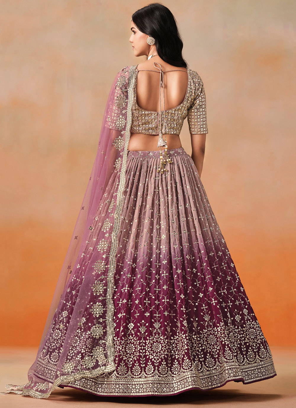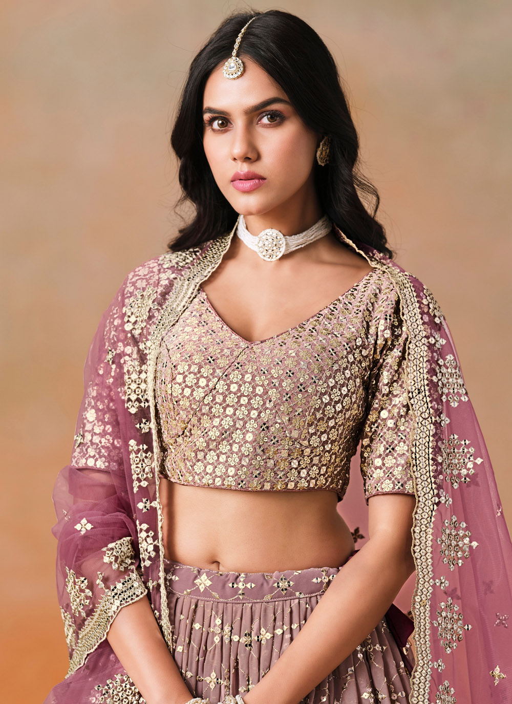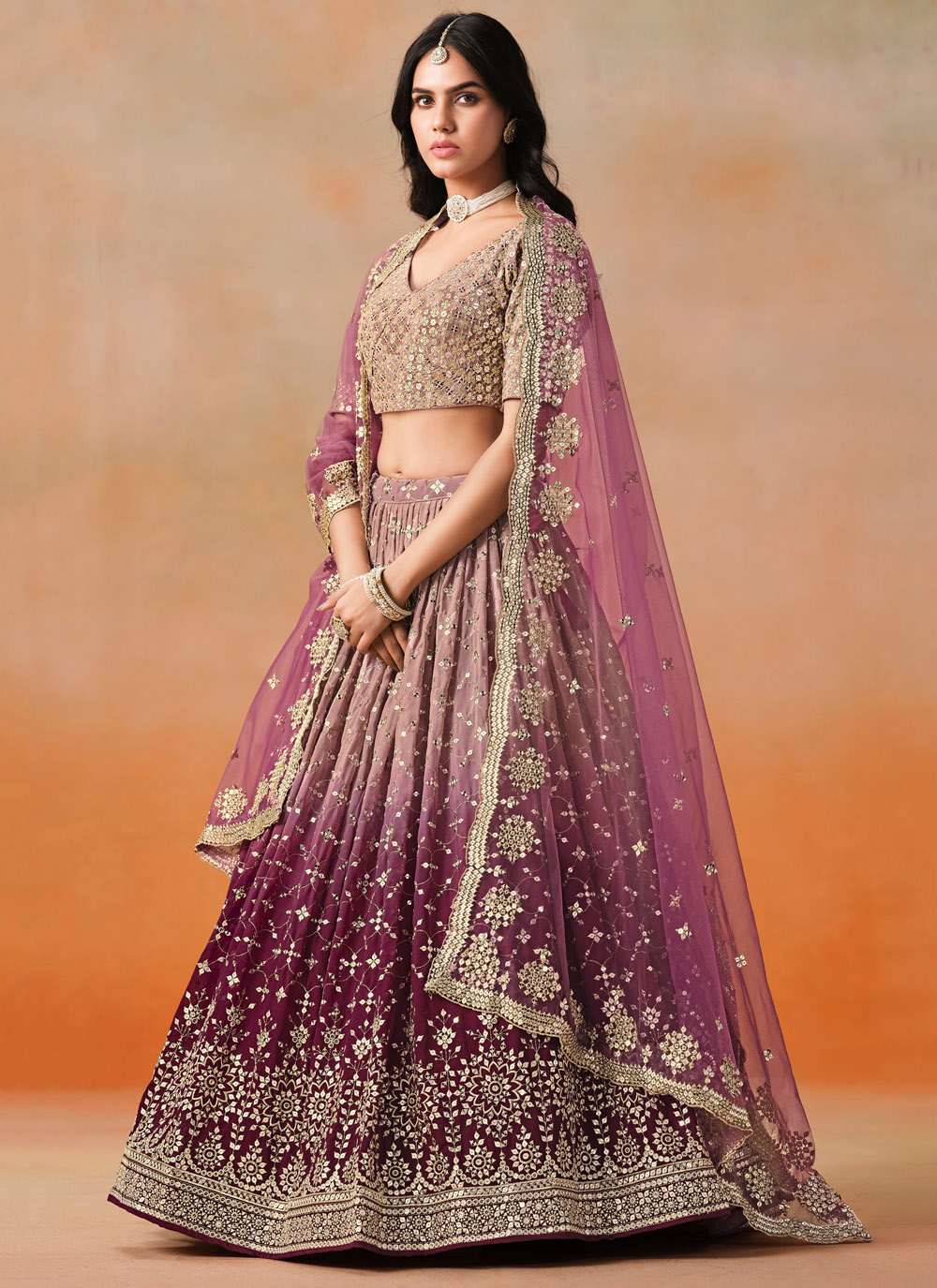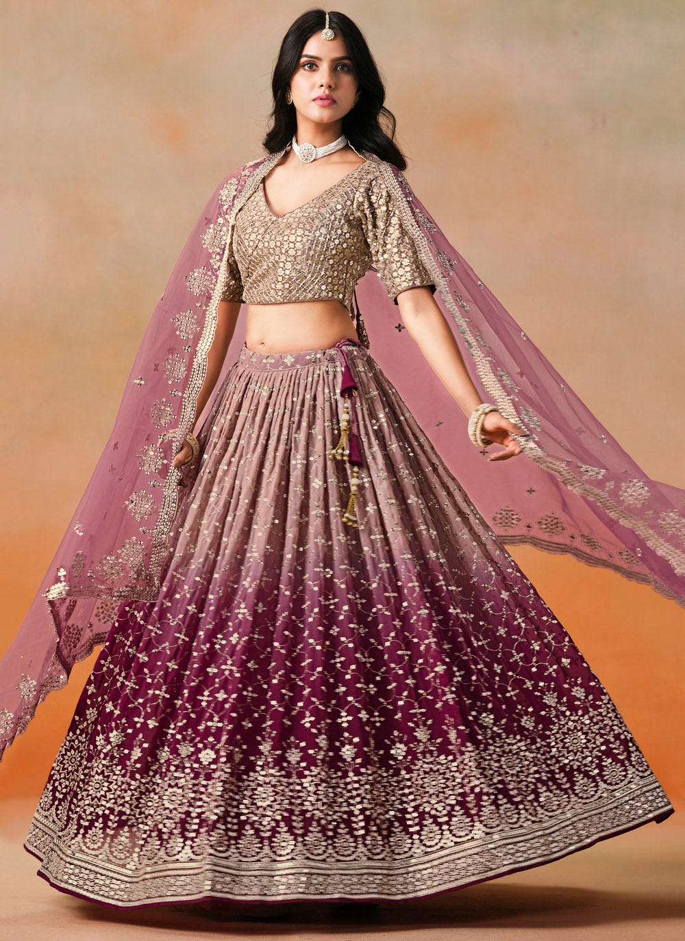Draped in royalty, this designer maroon lehenga choli is crafted in flowing georgette with intricate zari and sequin embroidery. Ideal for weddings, sangeet or receptions, it promises to make you shine with elegance and grace. Comes with matching choli and dupatta.