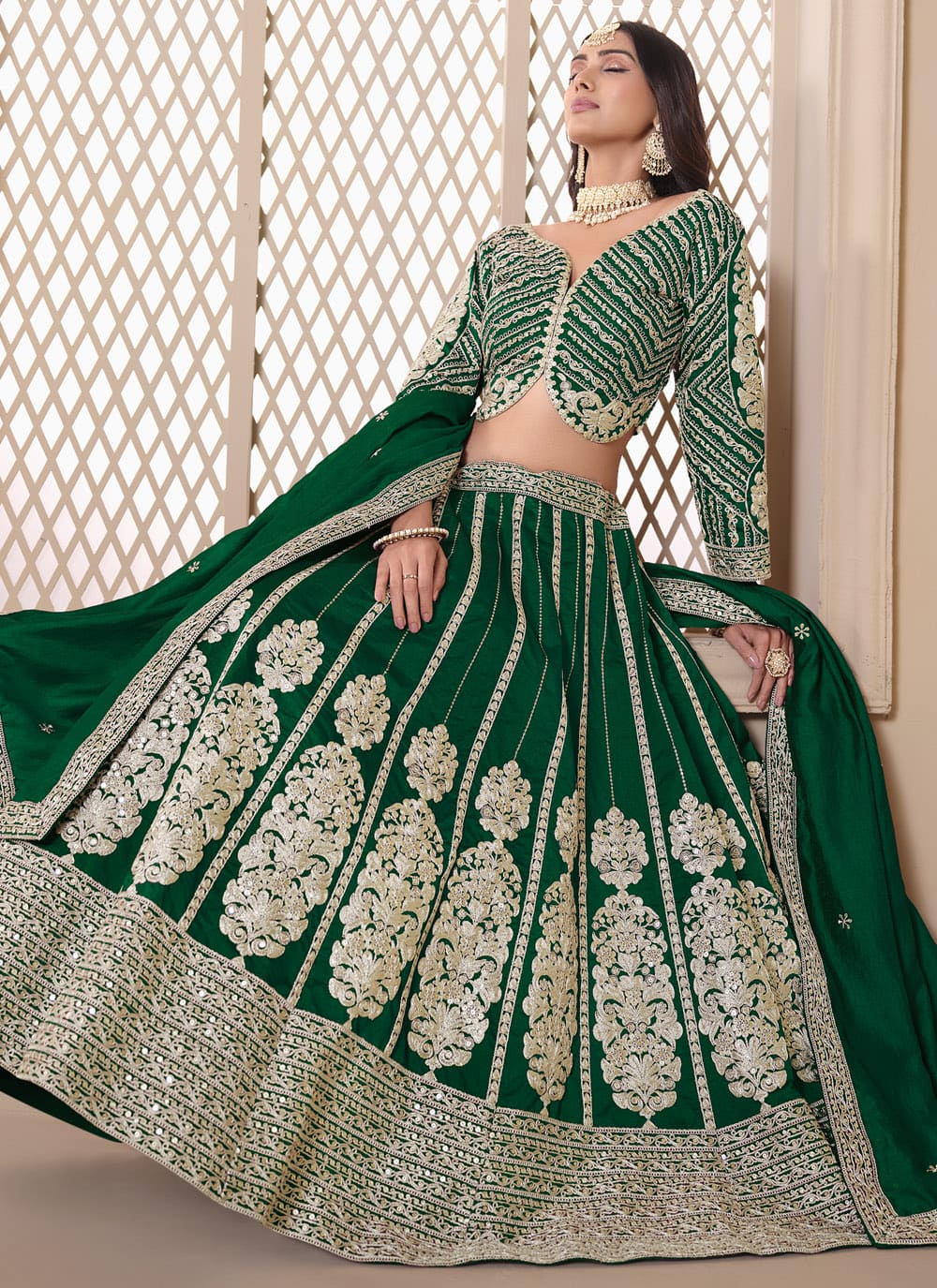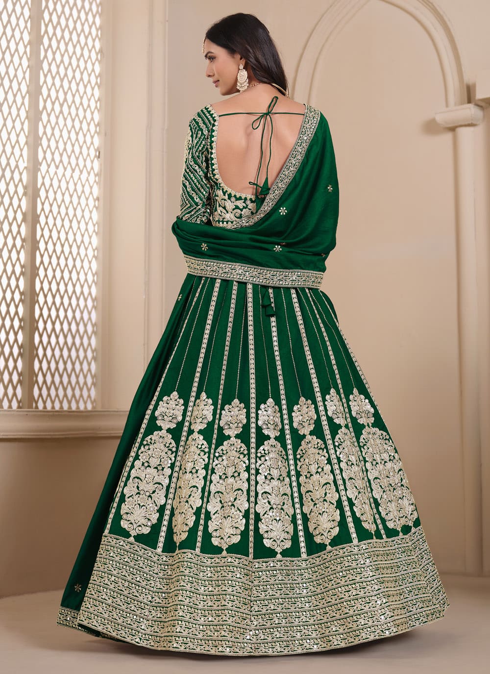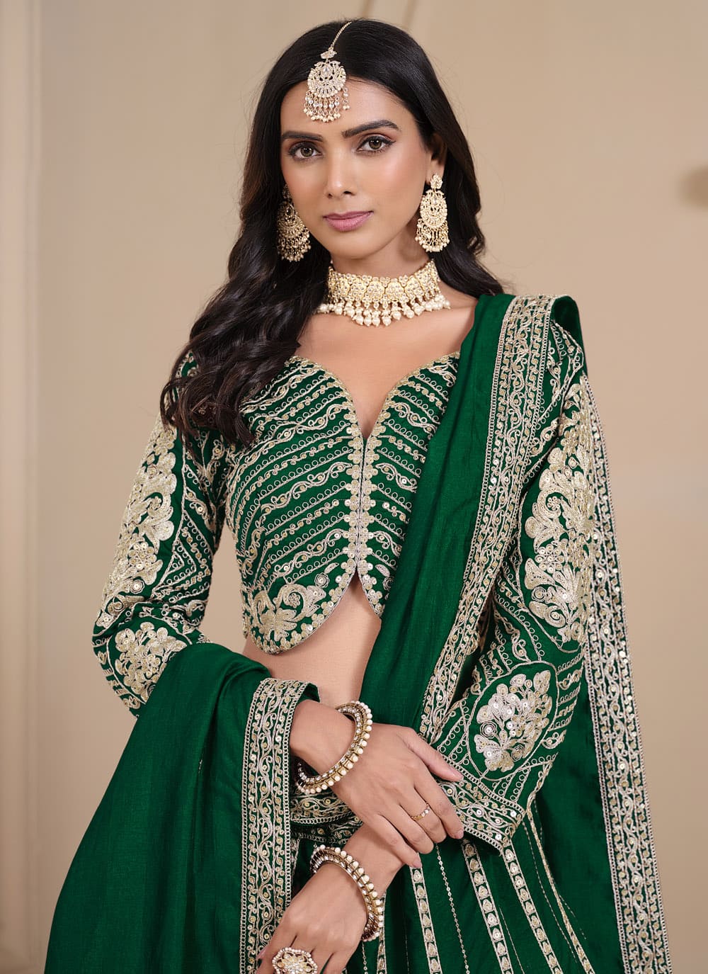 Step into luxury with this Sequins and Zari Embroidered Green Art Silk Lehenga Choli. The finely embroidered patterns on the luxurious silk fabric create a captivating aura, making it a must-have for bridesmaids, festive gatherings, and traditional ceremonies. Comes with matching choli and dupatta.