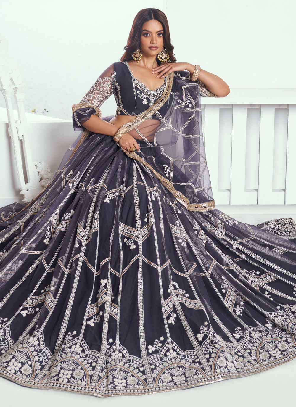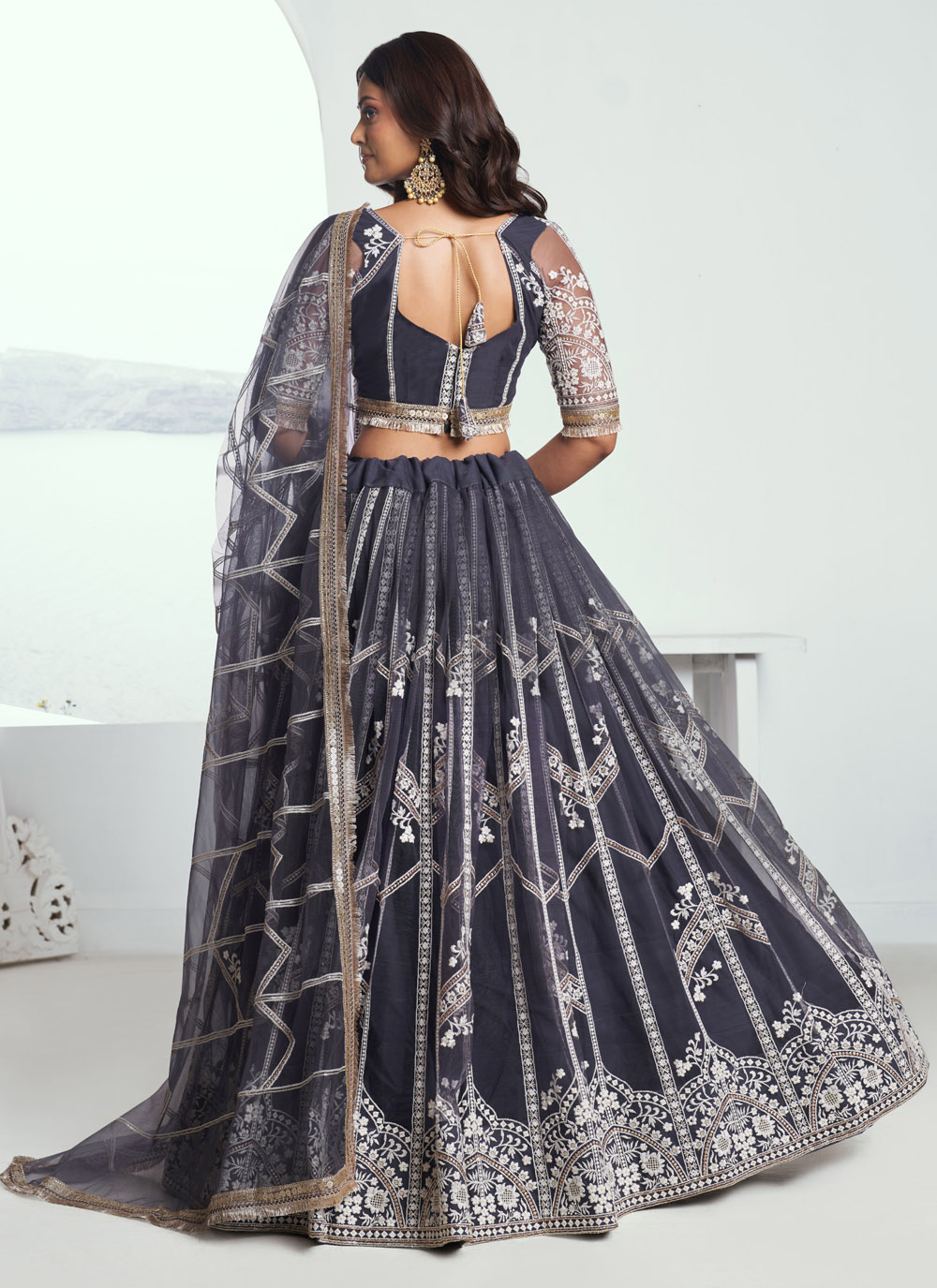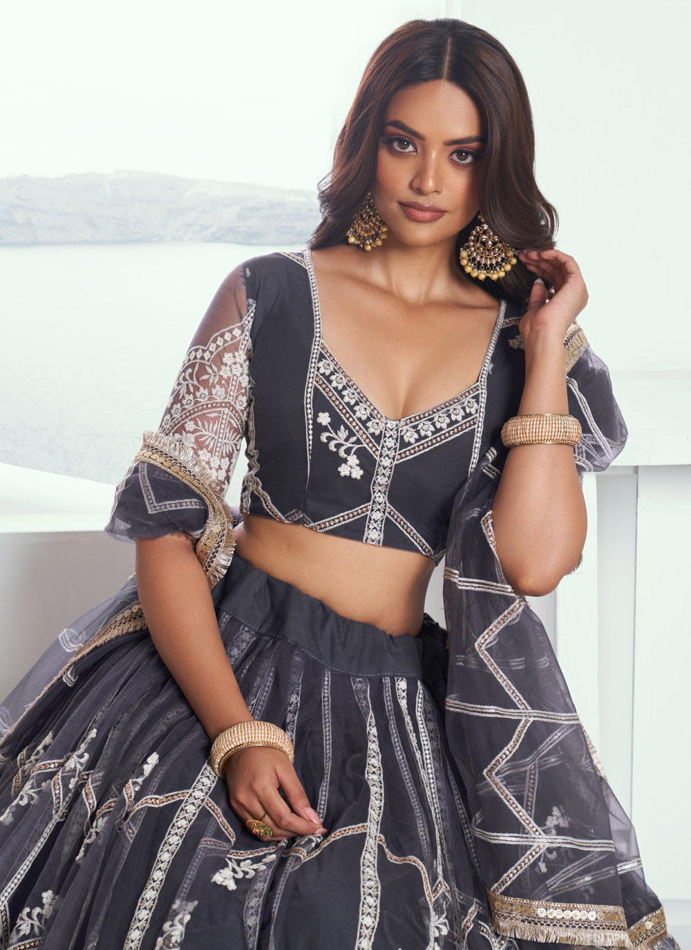 Featuring elegant embroidery and soft lace detailing, this Designer Grey Lehenga Choli strikes the perfect balance between traditional grace and contemporary appeal. A timeless piece made for grand events and stylish celebrations. Comes with matching choli and dupatta.