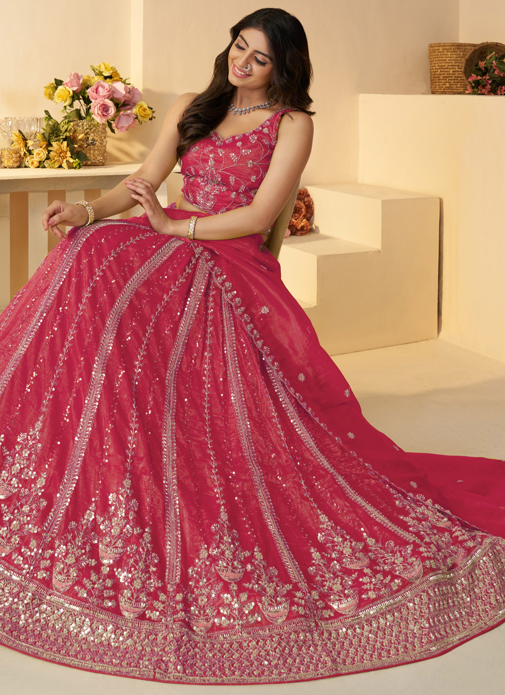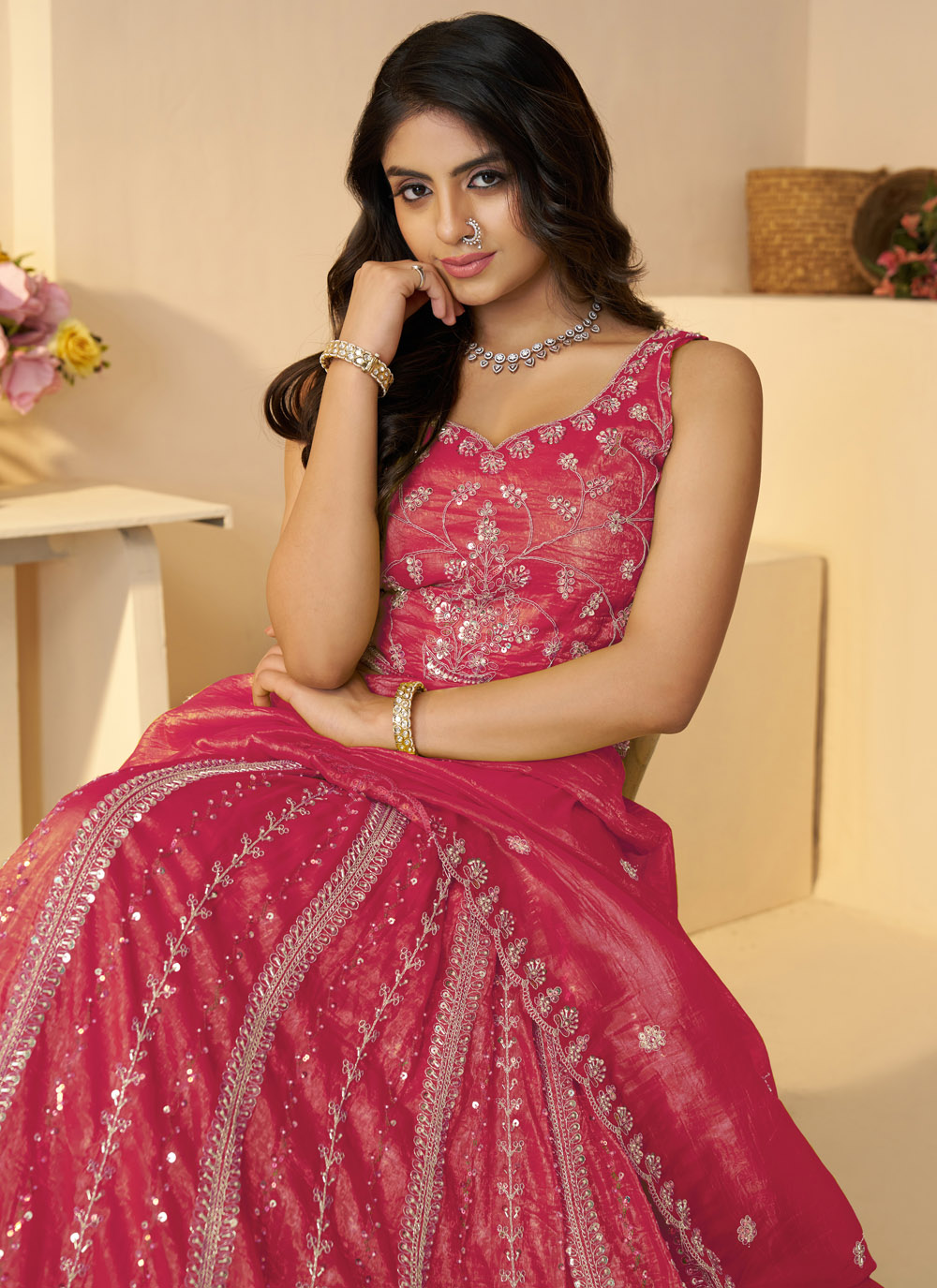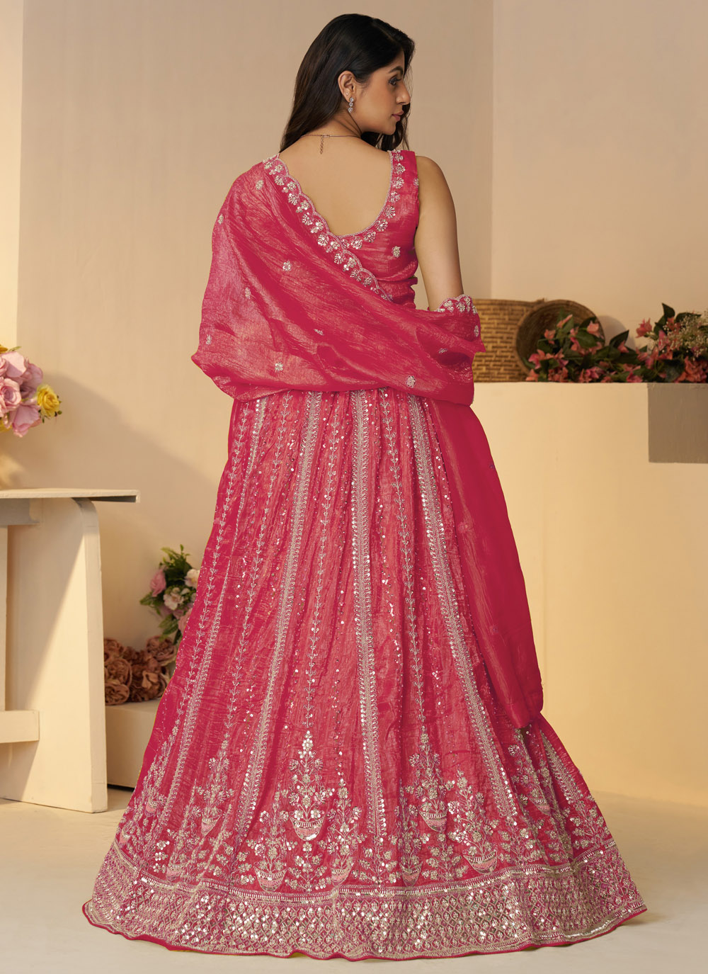 Elevate your ethnic style with this Designer Pink Lehenga Choli, featuring dazzling Jimmy Chu style sequins, intricate zari embroidery, and detailed cut dana work. The vibrant pink hue adds festive flair. ideal for weddings, sangeet, and reception. Comes with matching choli and dupatta.