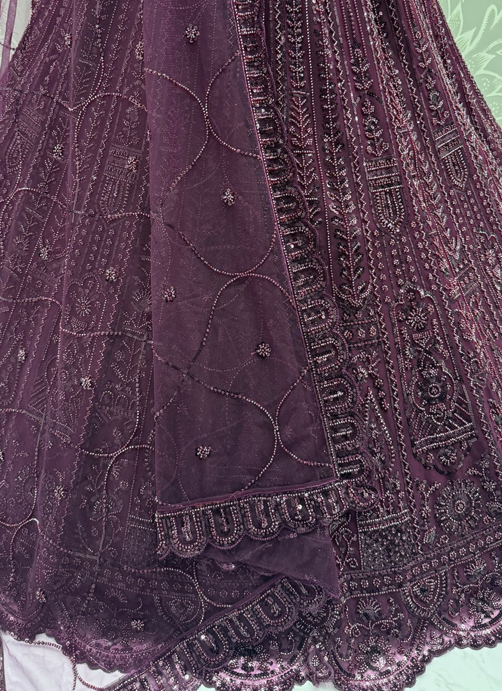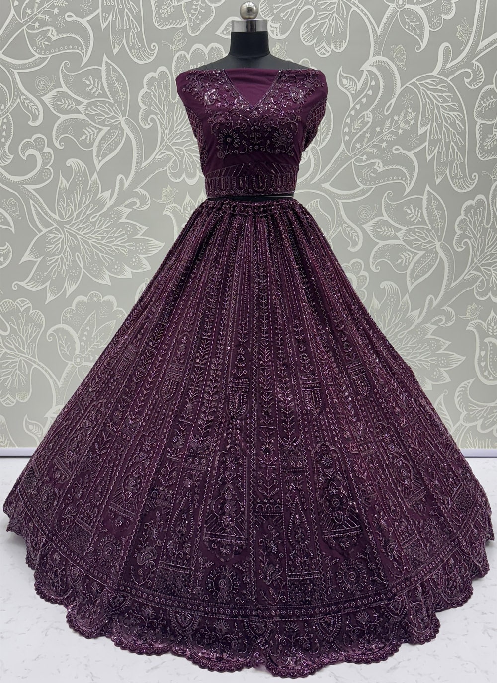 Crafted for the modern diva, this purple lehenga choli in soft net features all-over sequins embroidery, delicate cutdana accents and elegant thread designs. A premium outfit that shines with sophistication and style. Comes with matching choli and dupatta.