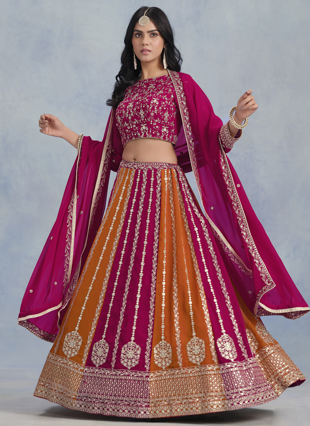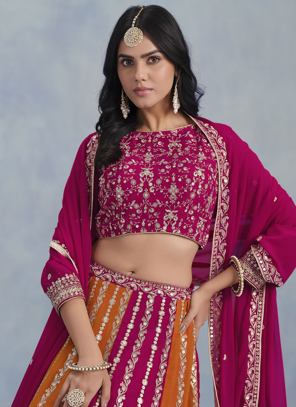 Featuring a beautiful mix of orange and rani colors, this lehenga choli is embroidered with stunning sequins and Zari work, creating a mesmerizing design. The Faux Georgette fabric offers comfort and style, making it perfect for celebrations, weddings and other festive occasions. Comes with matching choli and dupatta.