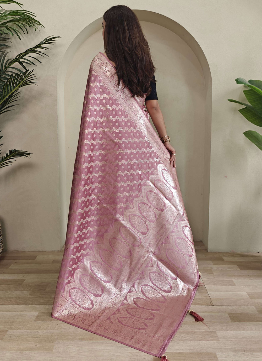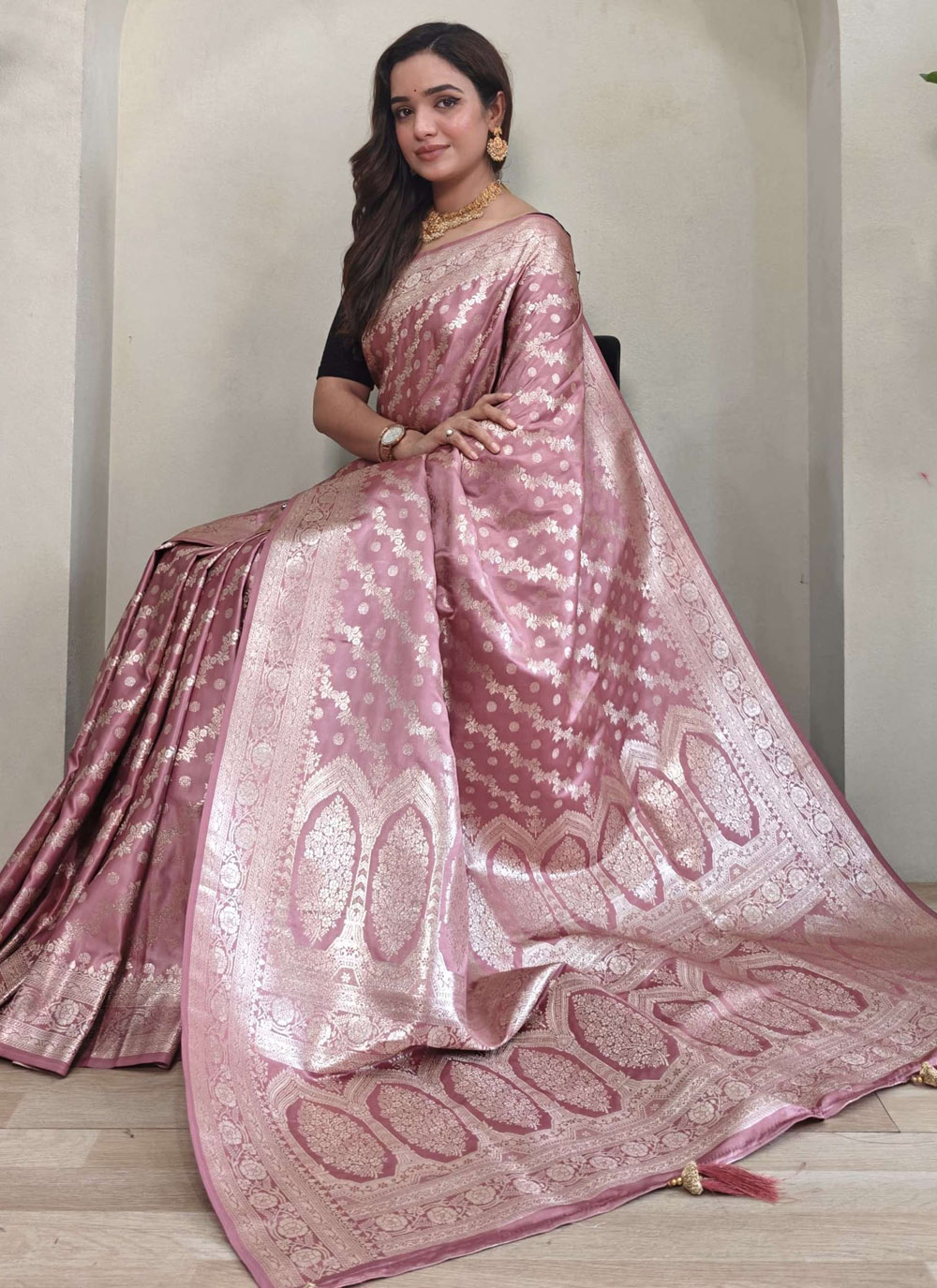 Drape yourself in timeless beauty with this designer satin pink saree, enriched with classic zari weaving. The soft satin finish and elegant detailing make it perfect for weddings, cultural events, and festive gatherings. Comes with matching blouse.