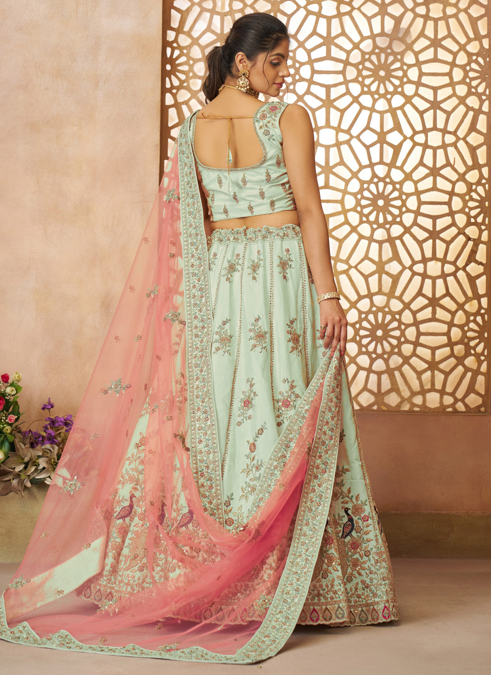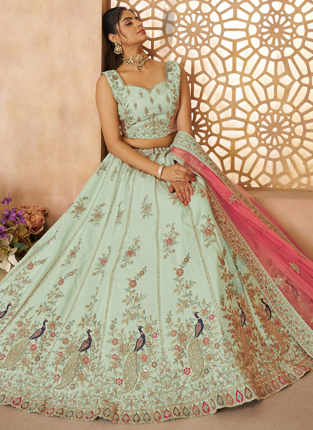 Designed for grand events, this sea green lehenga choli showcases premium silk fabric embellished with ornate stone, zari, and thread embroidery—ideal for weddings, receptions, or sangeet nights. Comes with matching choli and dupatta.