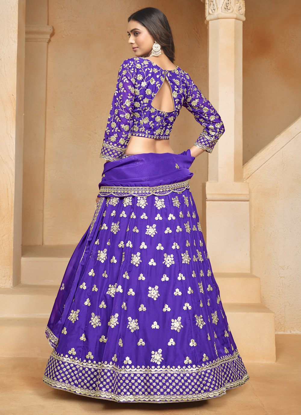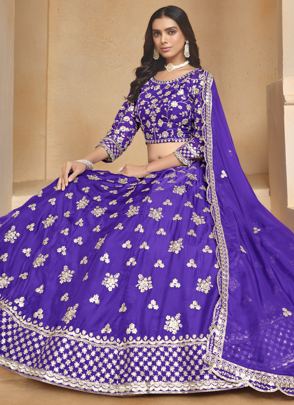 This stunning violet lehenga choli is a celebration of detailed handwork. Featuring elegant sequins and thread embroidery on rich organza, it brings traditional charm fused with a modern silhouette, ideal for receptions and sangeet. Comes with matching choli and dupatta.