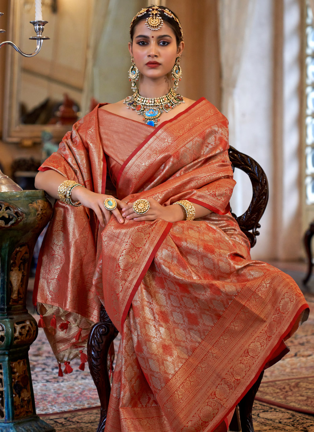 This designer orange saree in pure silk showcases delicate zari weaving that adds a touch of luxury. The vibrant shade and neat craftsmanship make it a standout choice for women who love classy traditional wear. Comes with matching blouse.