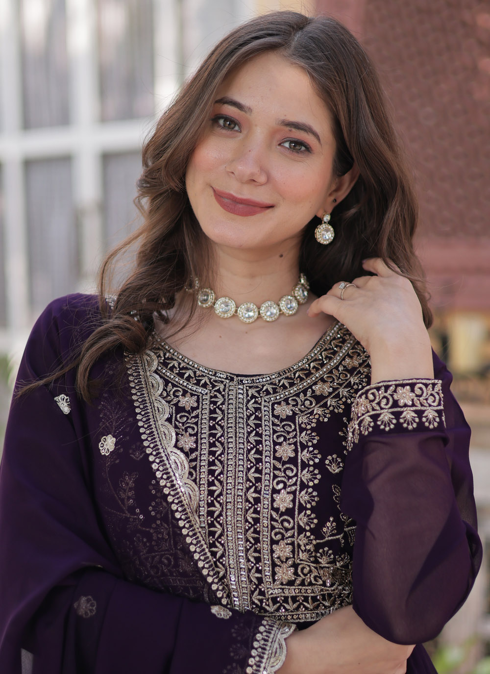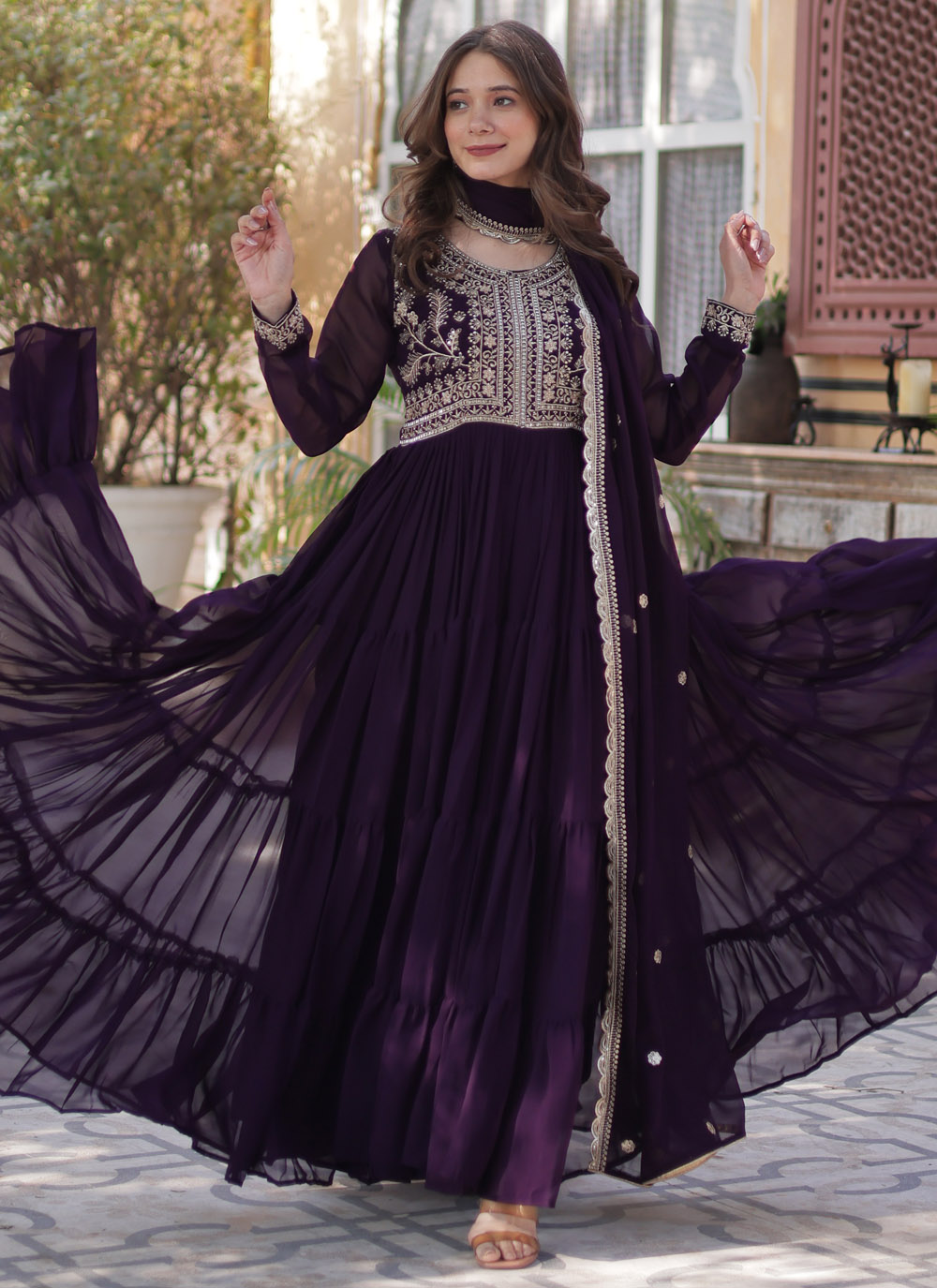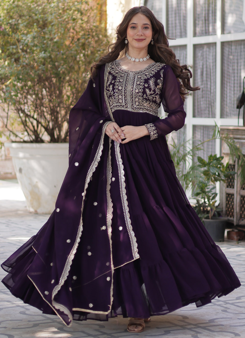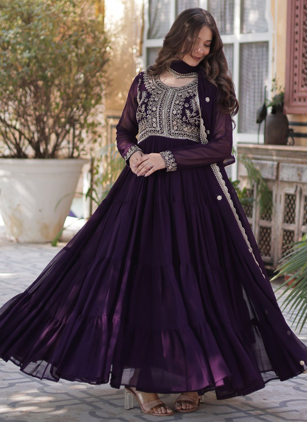 Step into luxury with this Wine Faux Georgette Designer Gown, where fine craftsmanship meets elegant design. The delicate stone and sequins embroidery enhances its charm, while the lightweight faux georgette fabric offers comfort and ease of movement. Comes with matching dupatta.