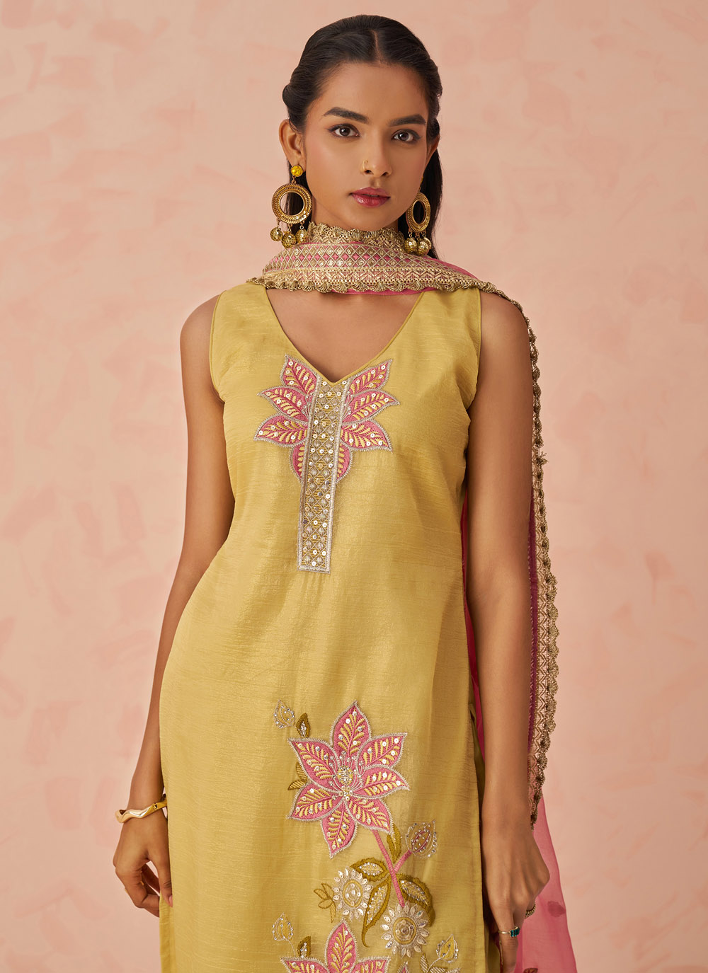 This Designer Yellow Salwar Kameez offers a modern twist on a classic look with its crushed texture and intricate embroidery. The ready-to-wear set is perfect for festive occasions or casual celebrations. Comes with matching bottom and dupatta.
