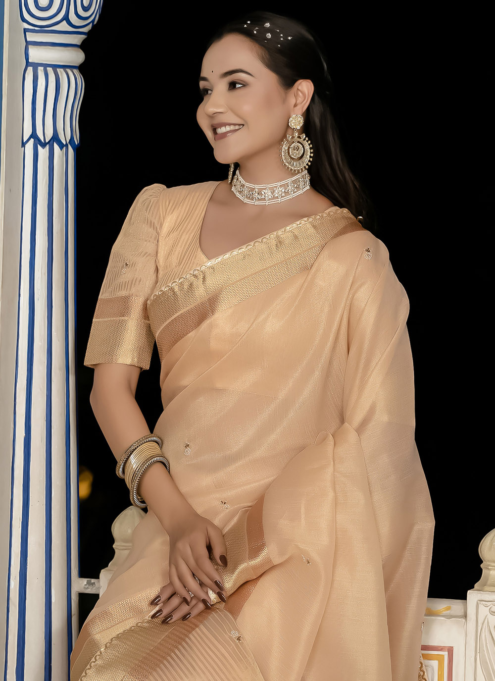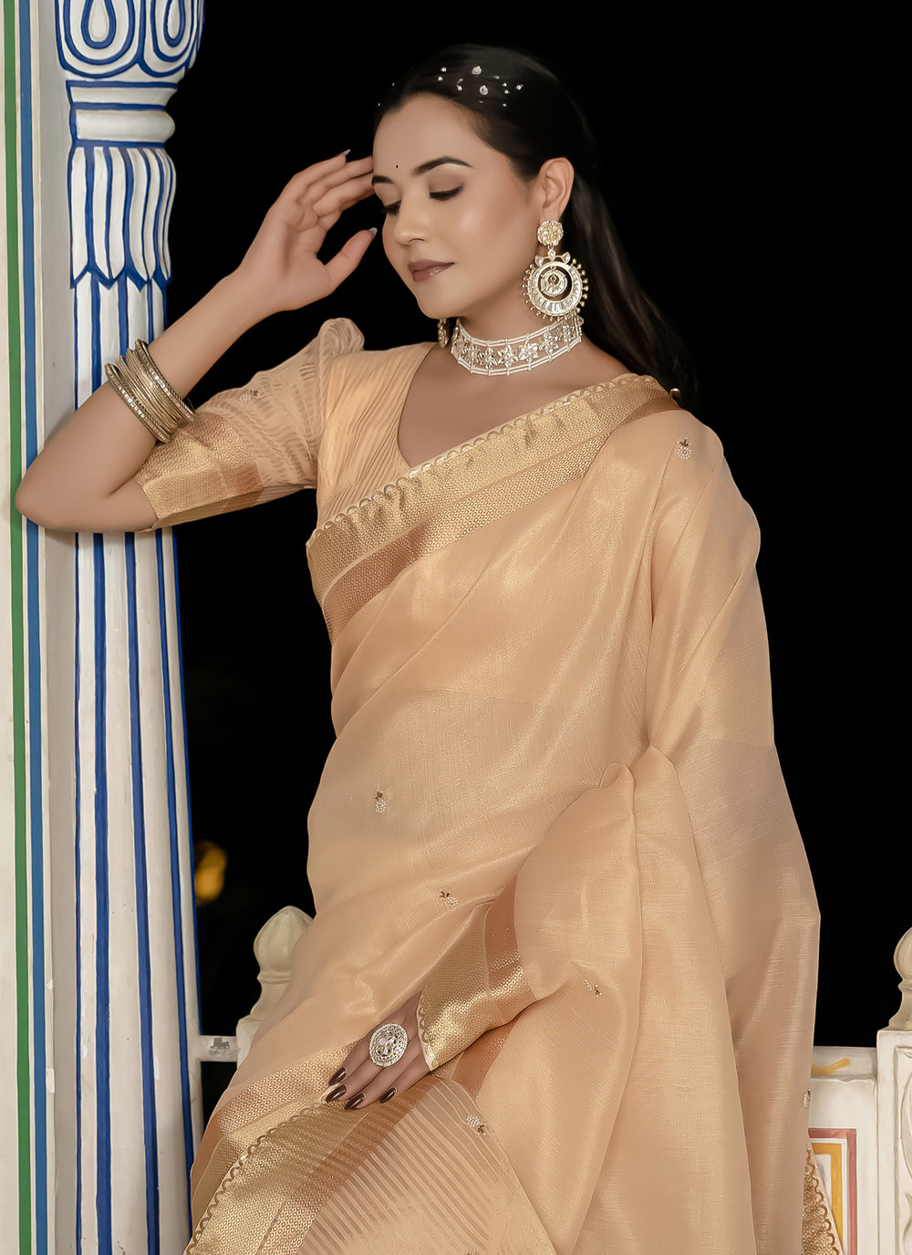 This graceful peach tissue linen saree features intricate khatli patterns, delicate booti motifs and shimmering zari highlights along the pallu and border. A beautiful blend of heritage craftsmanship and timeless style. Comes with matching blouse.