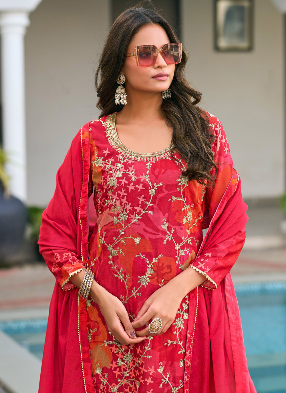 Grace meets glamour in this Rani-colored Chinon Salwar Kameez, featuring intricate zari embroidery and elegant digital prints. Its soft, flowy fabric drapes beautifully, making it a perfect pick for festive celebrations or traditional occasions. Comes with matching bottom and dupatta.