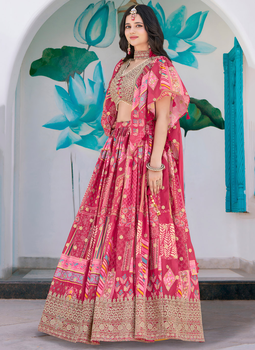 This pink engagement lehenga choli in luxurious Chinon fabric captures the perfect balance of modern aesthetics and traditional detailing. The vibrant digital print merges beautifully with zari and dori embroidery work, making you the showstopper at your ceremony. Comes with matching choli and dupatta.