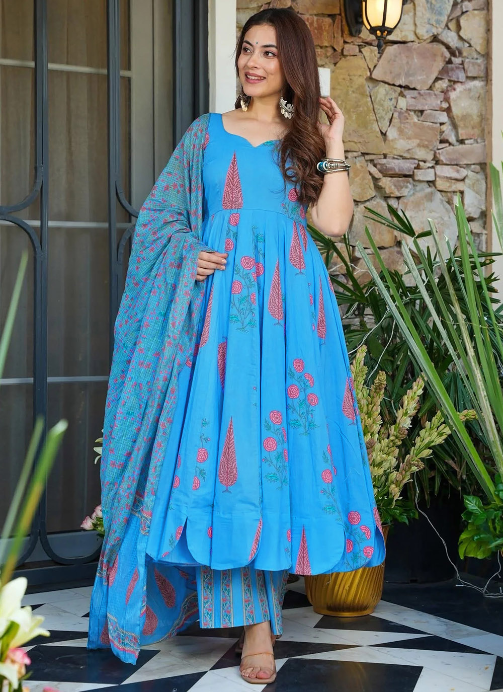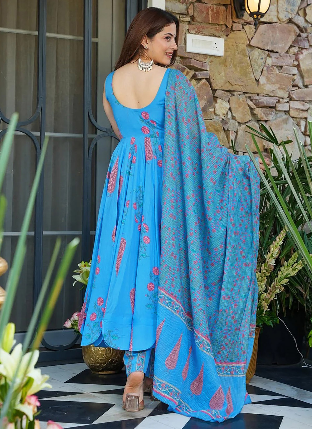 This festive muslin salwar suit in aqua blue blends contemporary digital printing with traditional elegance. Its soft texture, flowy drape, and stylish design make it a perfect choice for festive wear and special occasions. Comes with matching bottom and dupatta.