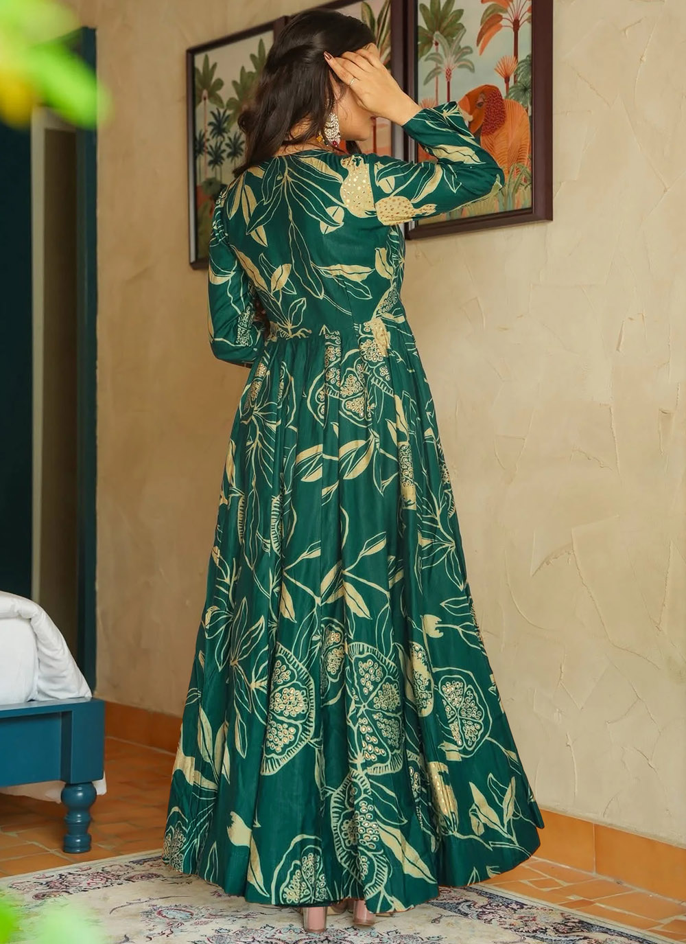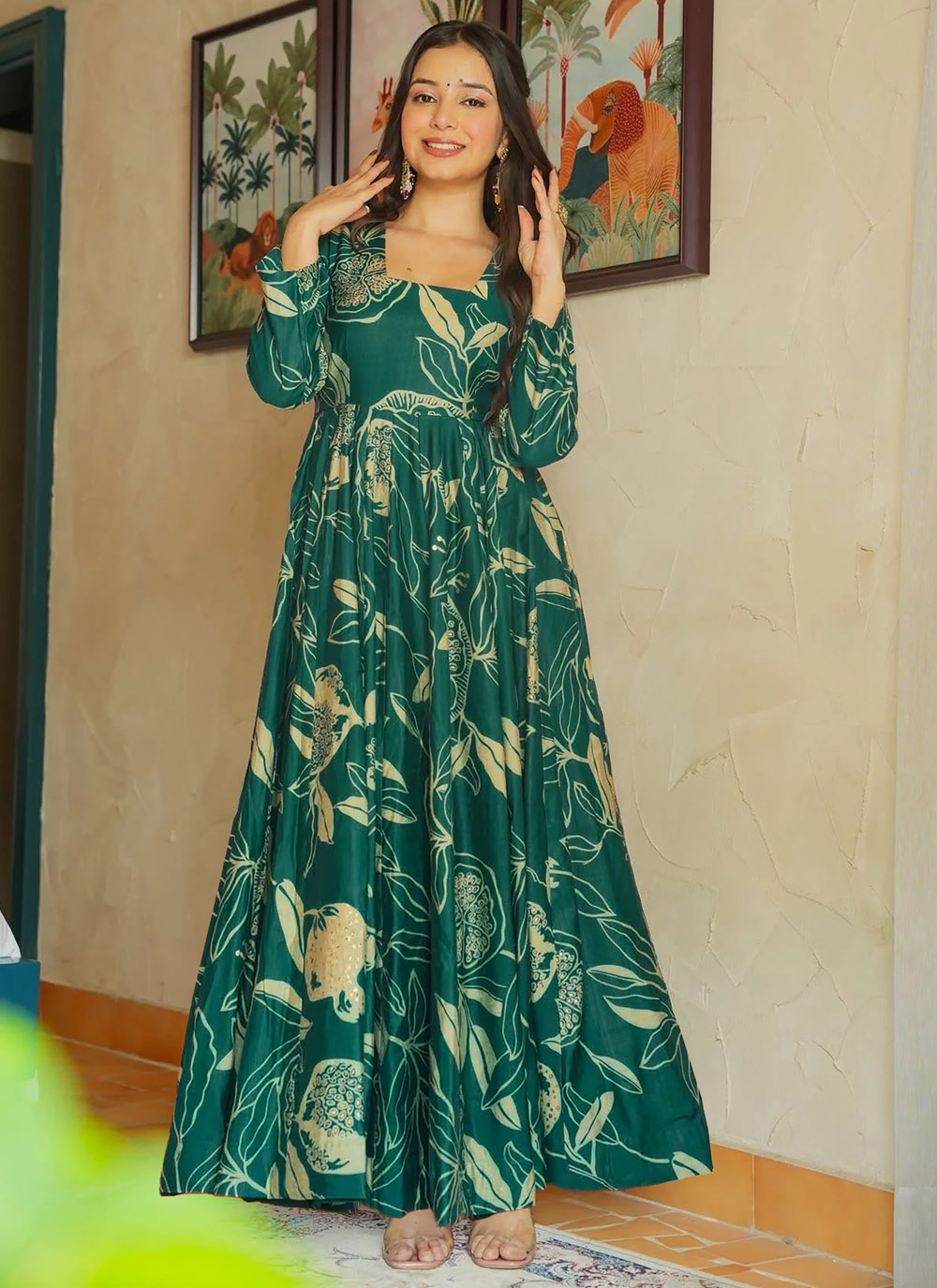 Crafted in breathable rayon, this green digital printed gown stands out with its classic Anarkali shape. The vibrant prints add charm, while the smooth fabric keeps you comfortable during long celebrations and traditional functions.