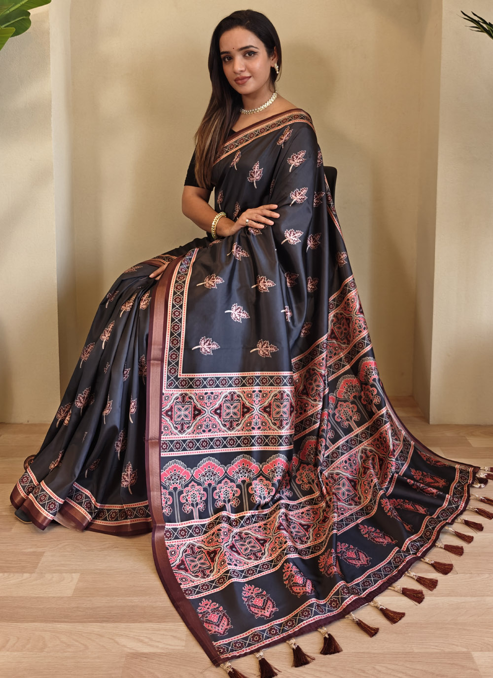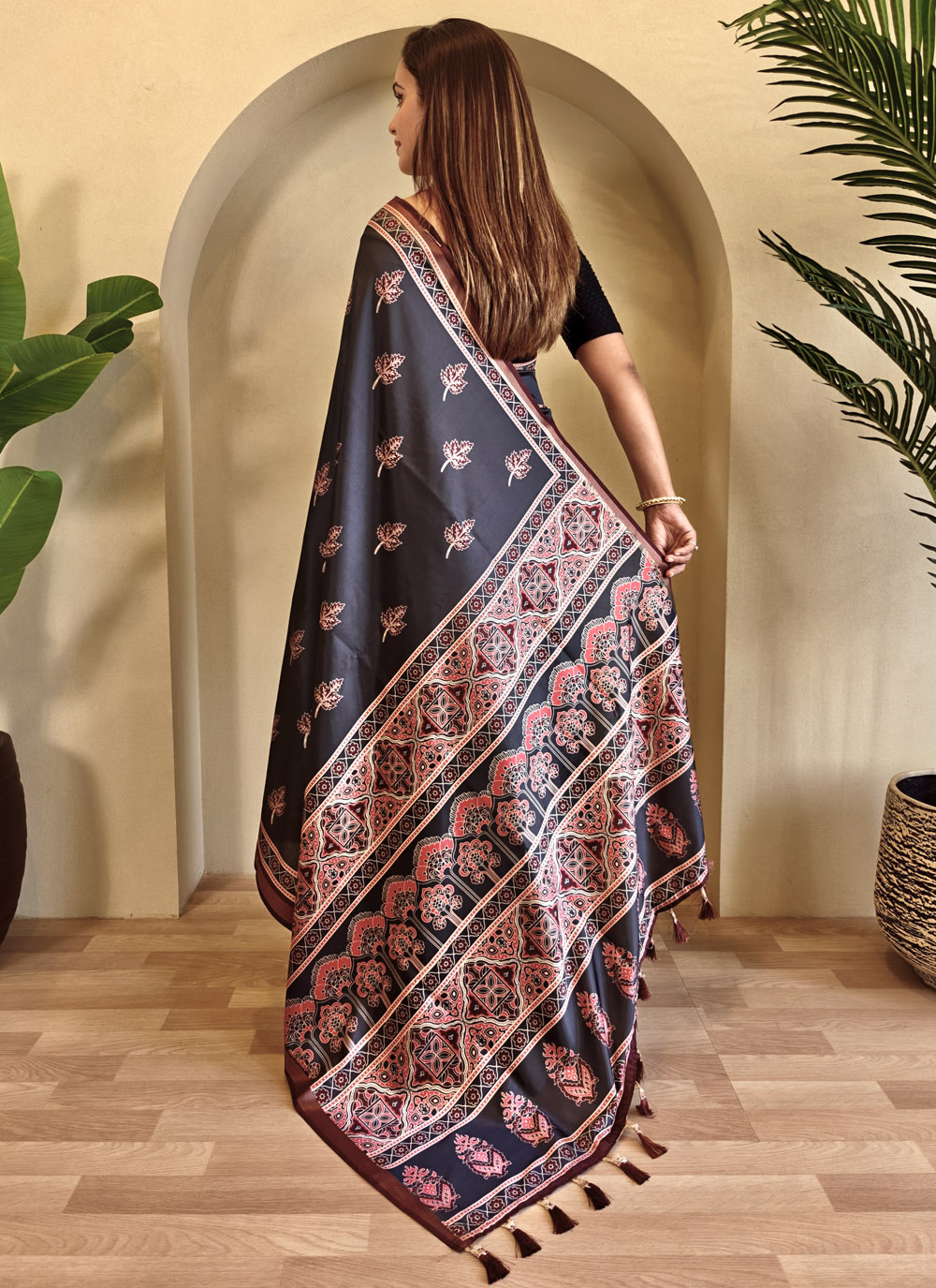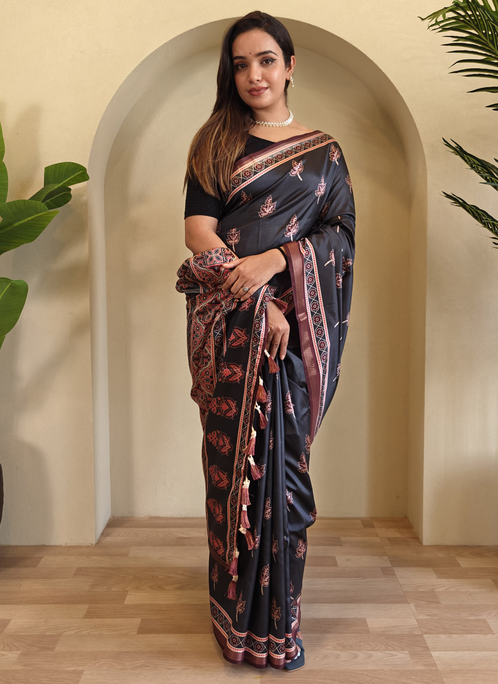 This Black Dola Viscose Saree with printed detailing is a beautiful balance of everyday comfort and traditional design. Perfect for both office days and festive evenings. Comes with matching blouse.