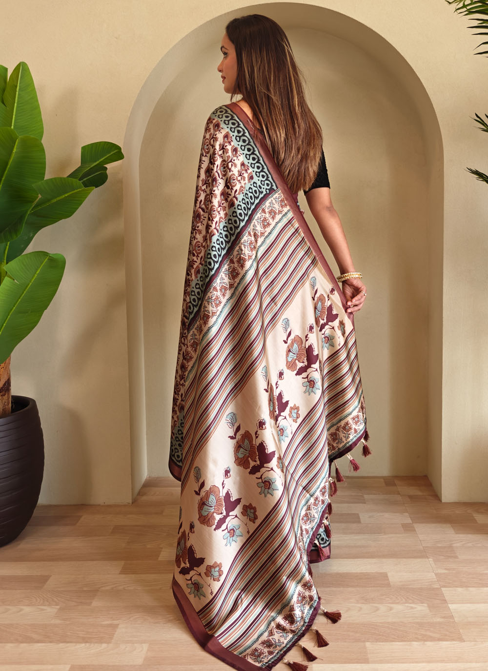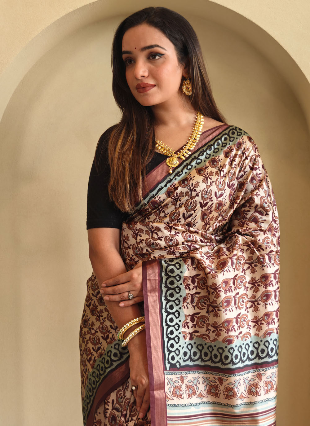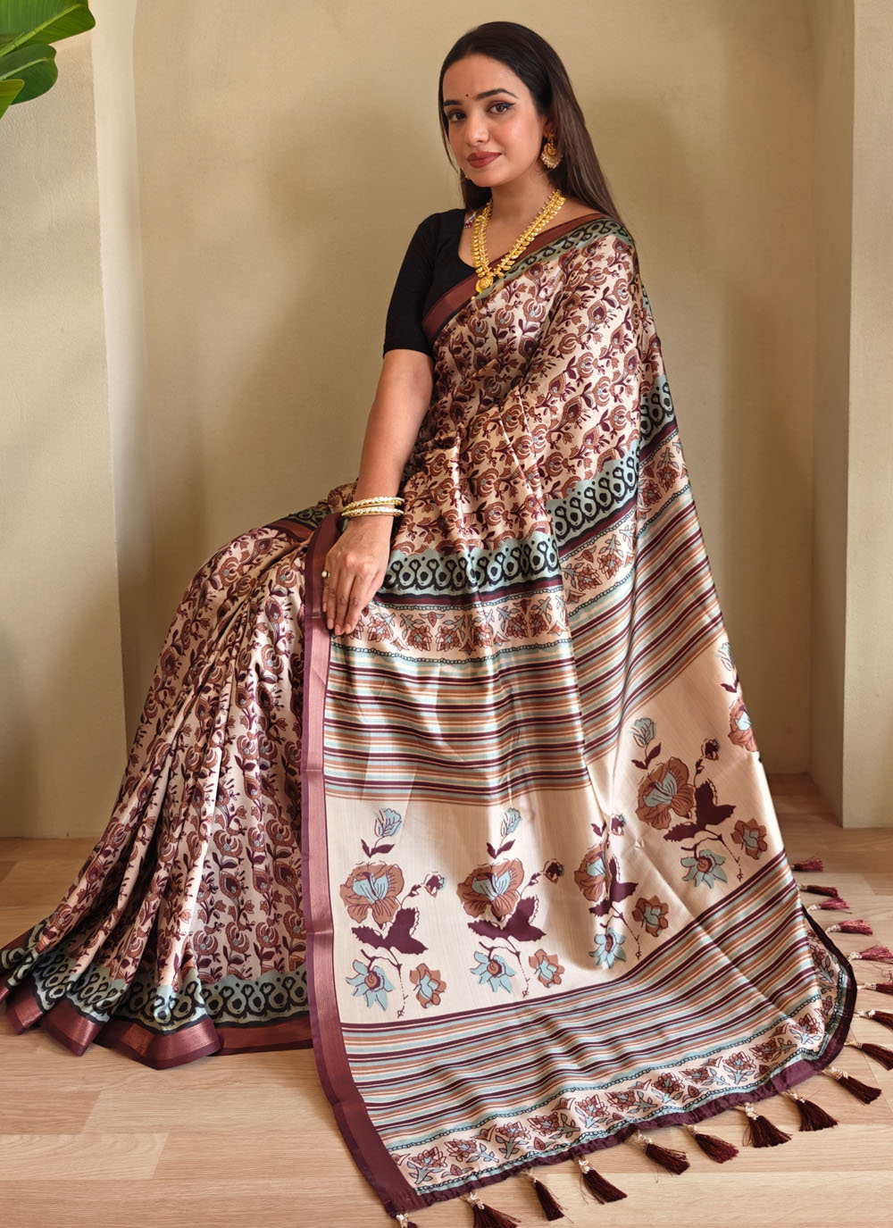 This Trendy Cream Saree in Dola viscose brings modern finesse to classic ethnic wear. Its smooth texture, graceful flow, and artistic digital print make it a standout pick for festive wear and cultural events. Comes with matching blouse.