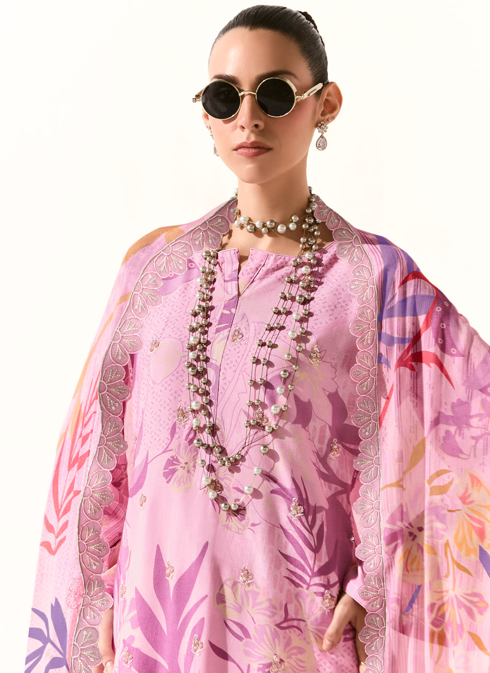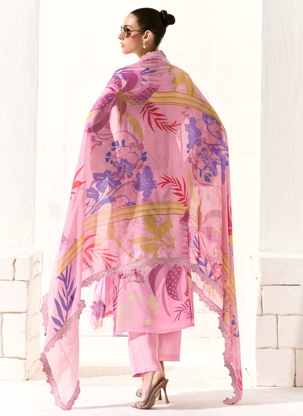 Elevate your ethnic wardrobe with this charming embroidered pink salwar kameez, enhanced with subtle digital print motifs. Designed to balance style and comfort, this outfit speaks of sophistication—ideal for festive occasions and family gatherings. Comes with matching bottom and dupatta.