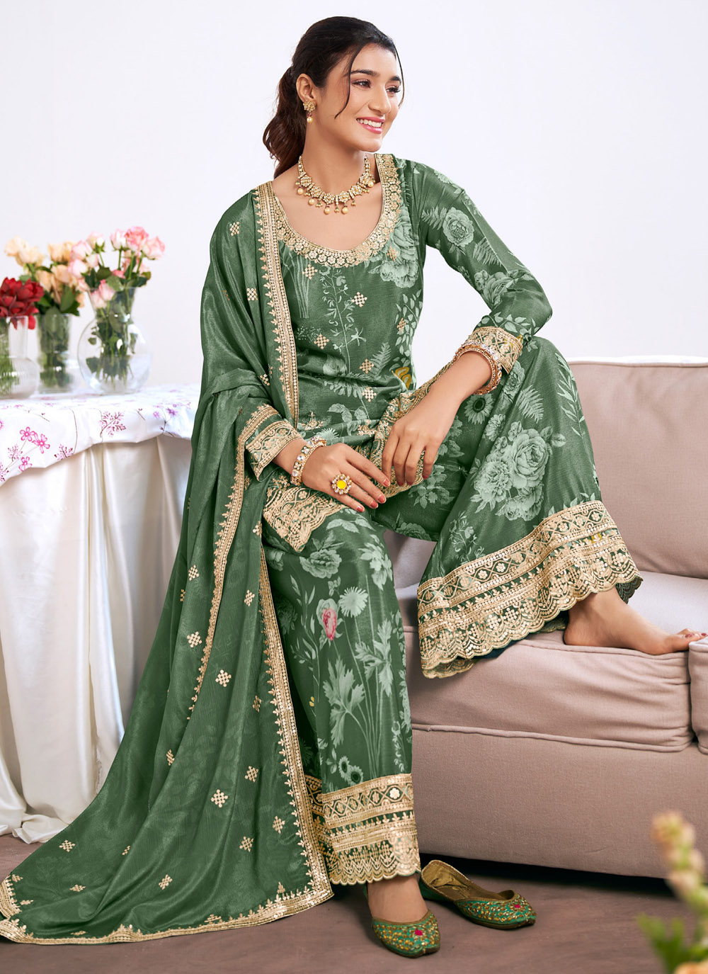 Designed in soothing green Chinon fabric, this readymade salwar kameez combines printed detailing with tasteful embroidery for a stylish ethnic statement. Comes with matching bottom and dupatta.