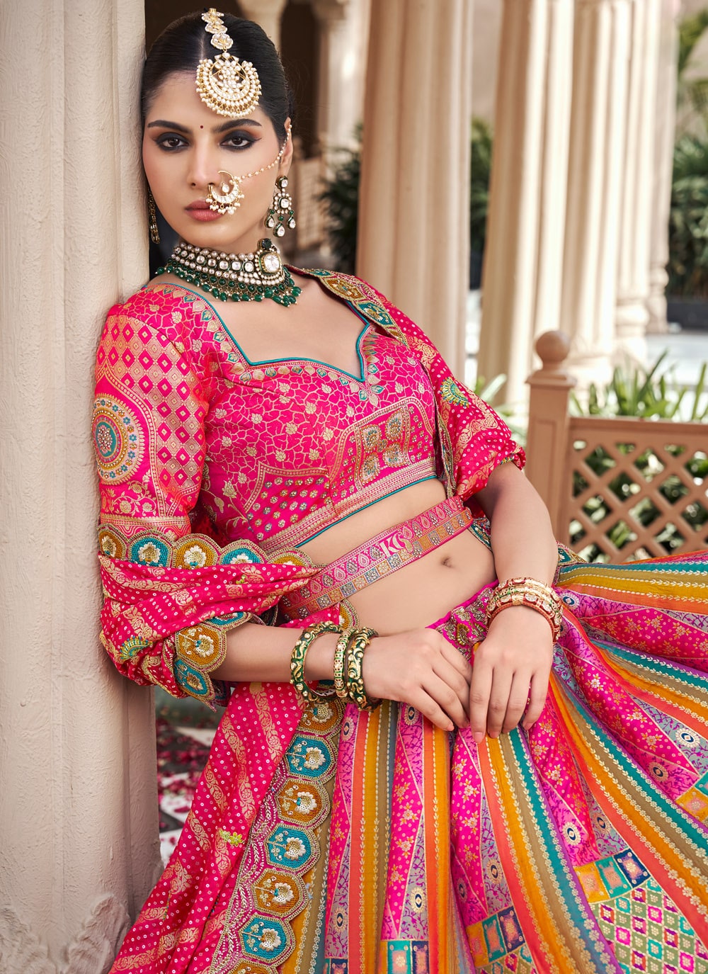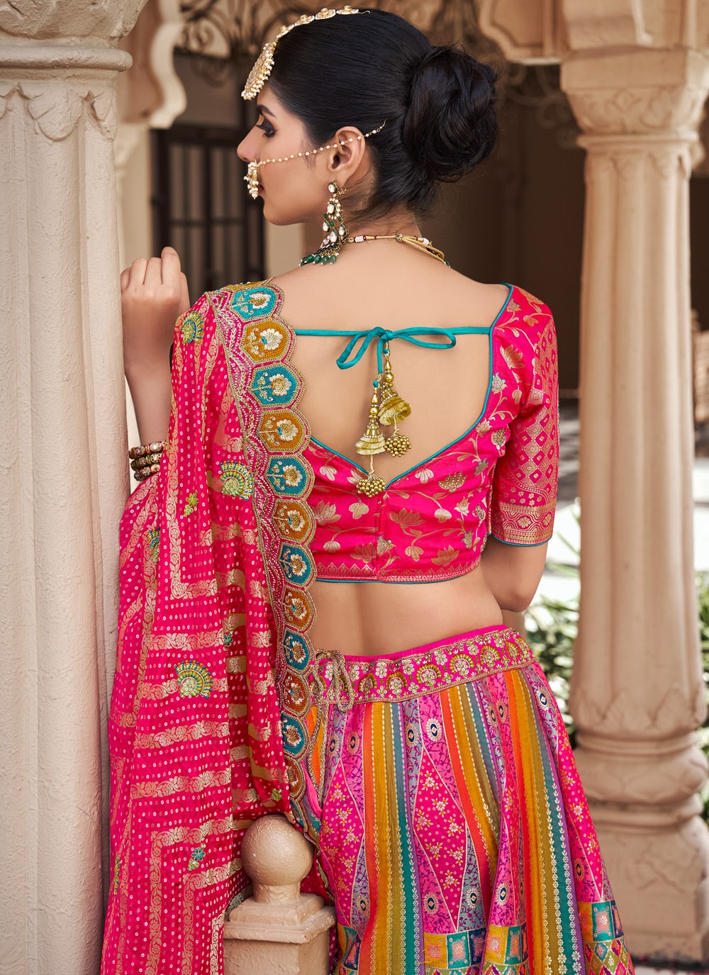 Designed for the woman who adores both elegance and vibrance, this embroidered Banarasi silk lehenga combines timeless weaving techniques with a contemporary multi-color palette. The rich texture and stunning embroidery make it ideal for grand celebrations. Comes with matching choli and dupatta.