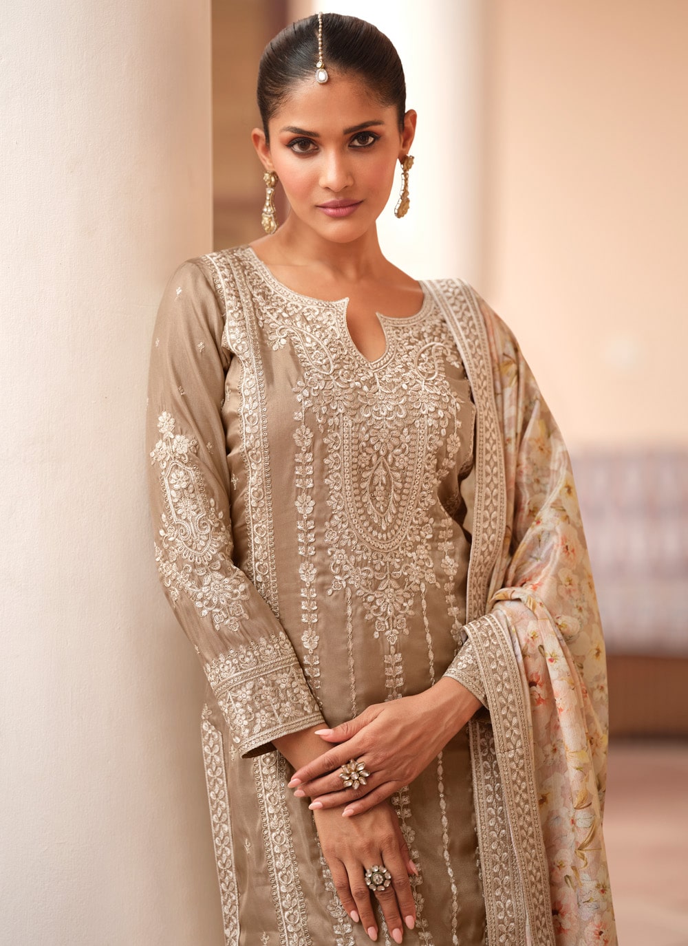 This embroidered beige salwar suit is crafted from premium silk, offering both elegance and comfort. The palazzo-style bottom adds a contemporary twist, while the detailed embroidery enhances its refined look. Comes with matching bottom and dupatta.