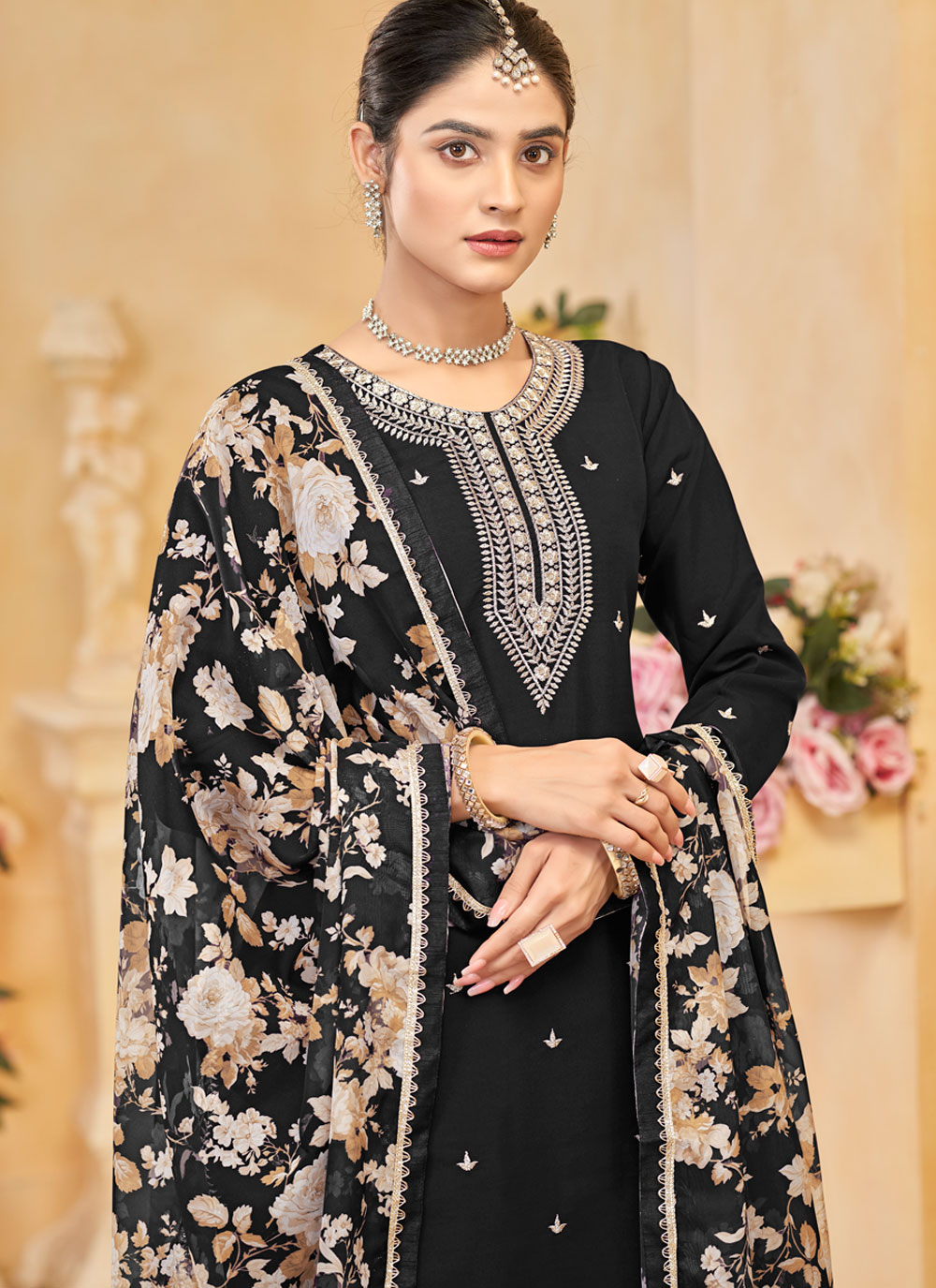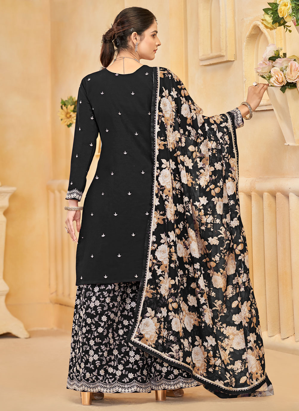 The Embroidered Black Designer Silk Palazzo Salwar Suit is the epitome of elegance and sophistication. Featuring intricate embroidery on luxurious black silk fabric, this stunning outfit comes with a matching bottom and dupatta, making it the perfect choice for weddings, festivals, and other special occasions.