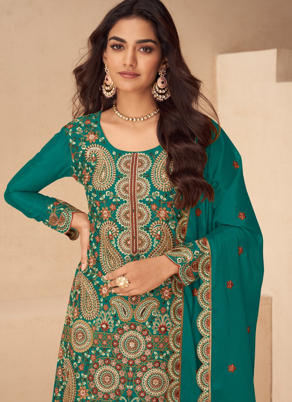 This sea green embroidered Chinon salwar suit beautifully blends tradition with contemporary appeal. Its delicate embroidery stands out on the soothing fabric, giving you a sophisticated outfit perfect for ceremonial events and special family occasions. Comes with matching bottom and dupatta.