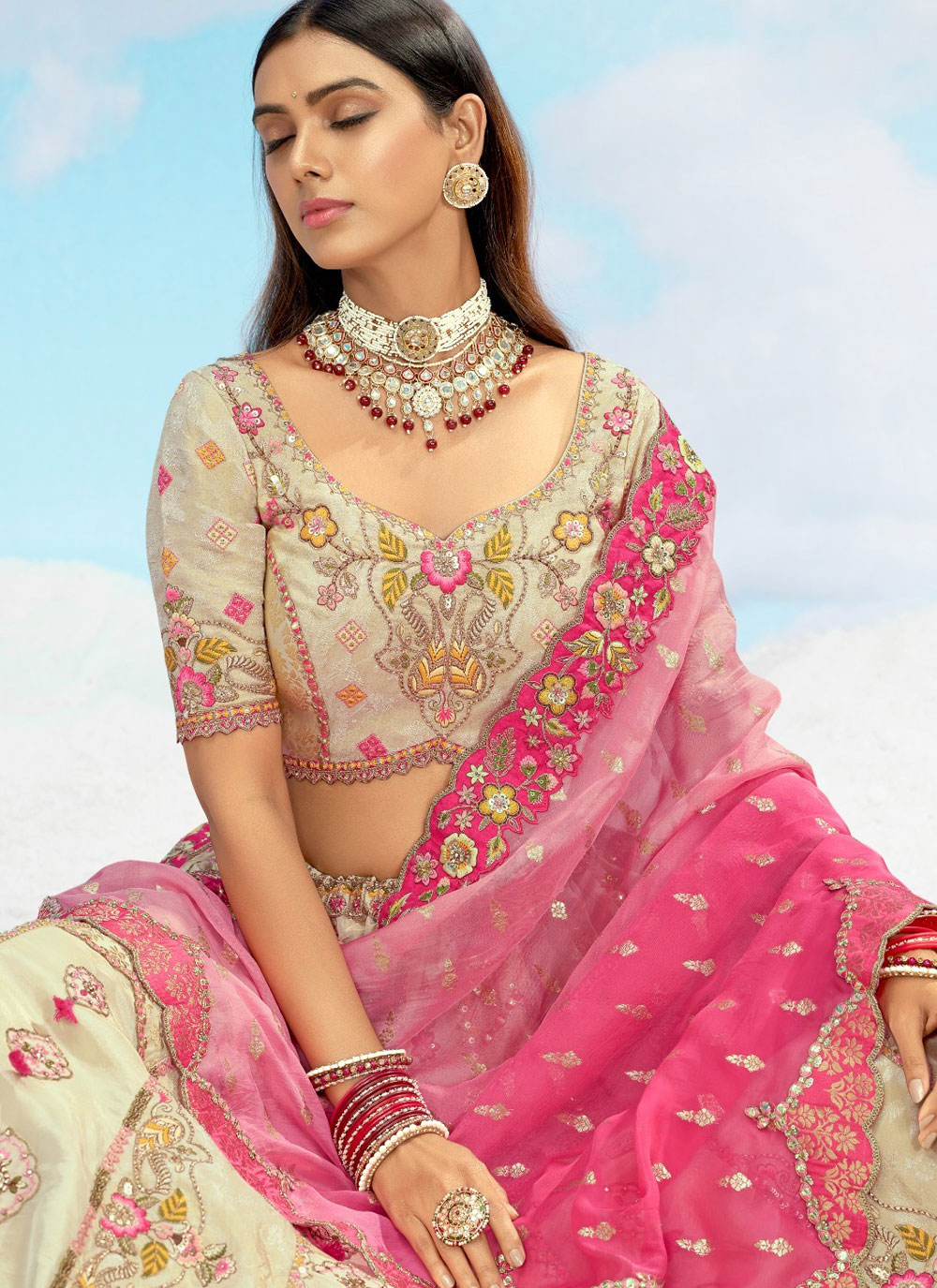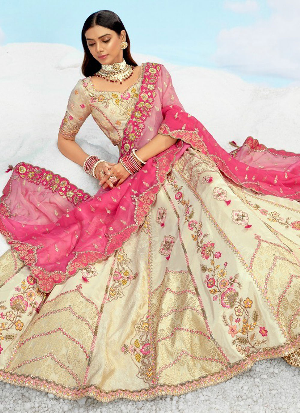 Elevate your bridal look with this stunning Sequins Stone Embroidered Cream Silk Lehenga Choli. The intricate embroidery featuring stones and sequins adds a touch of sparkle, while the luxurious silk fabric creates a flowing, graceful silhouette. Perfect for weddings, this trendy lehenga choli combines modern charm with traditional elegance.
