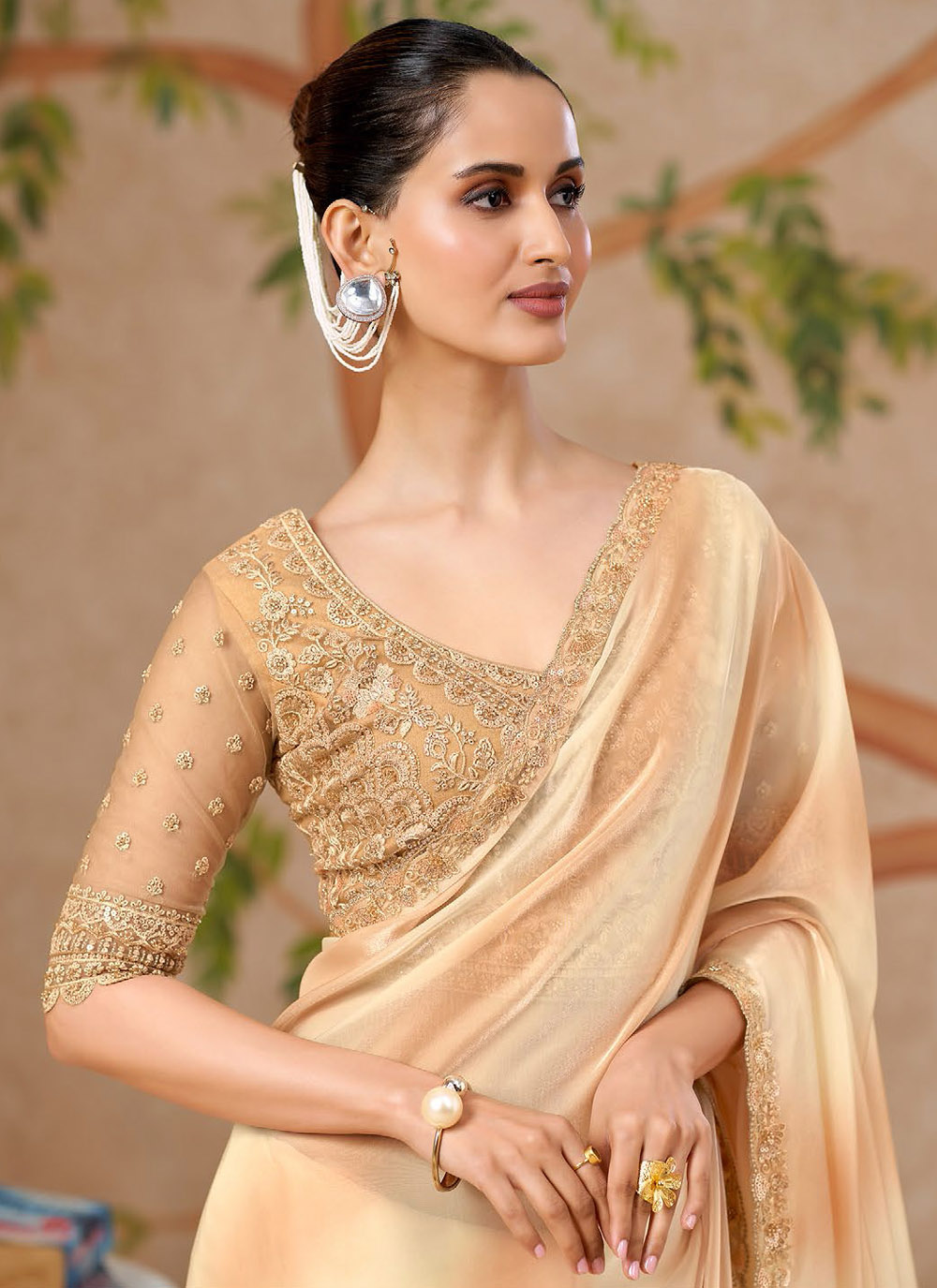 This Cream Fandy Traditional Saree features beautiful embroidered border work that enhances its subtle charm. Made from soft fandy fabric, it offers comfortable draping and effortless style. Comes with matching blouse.