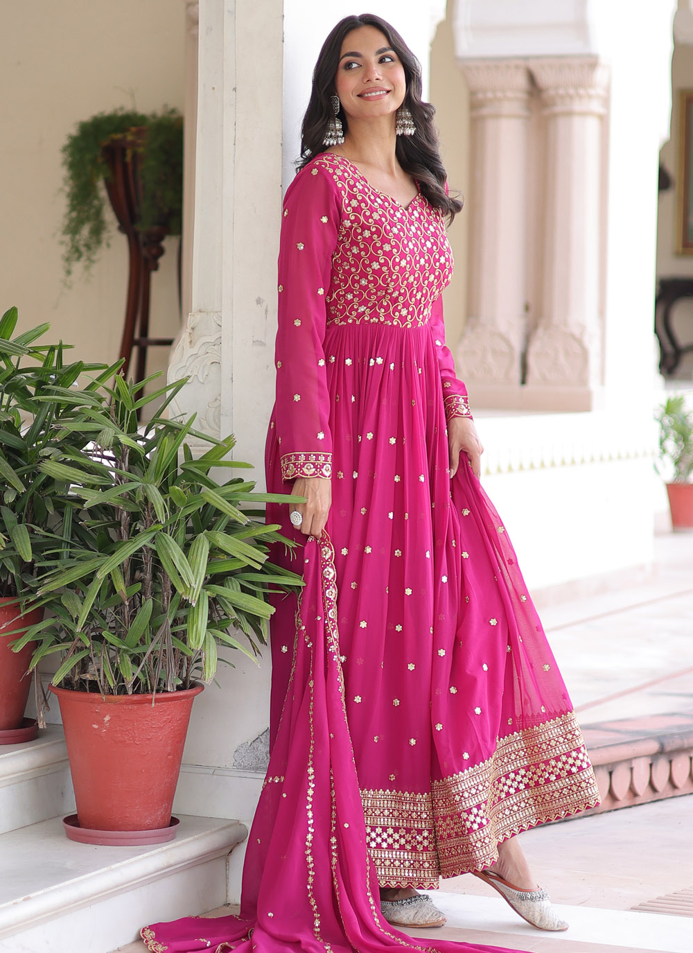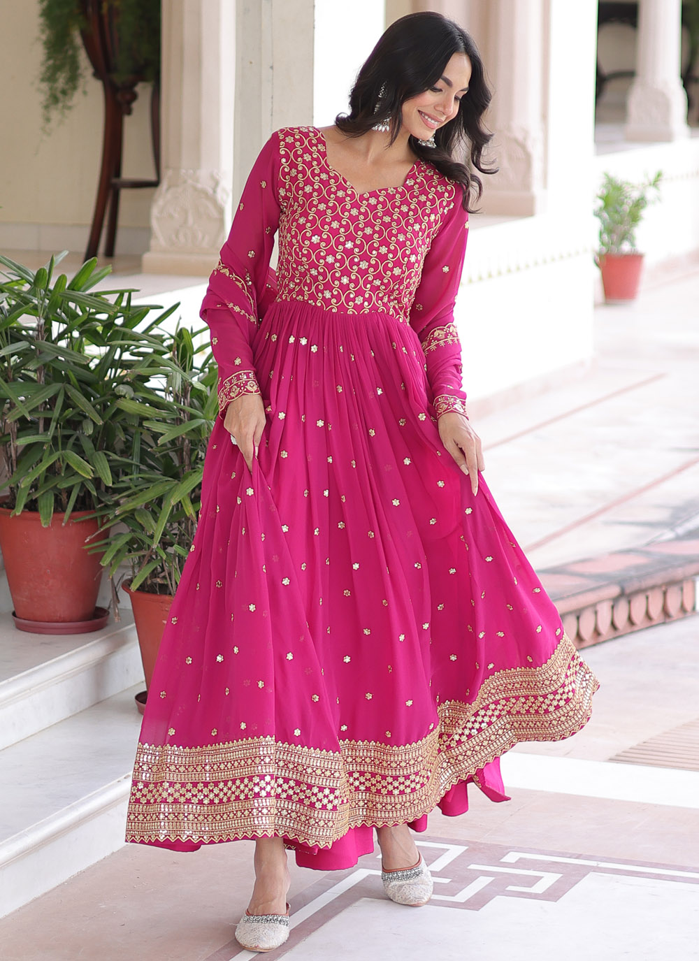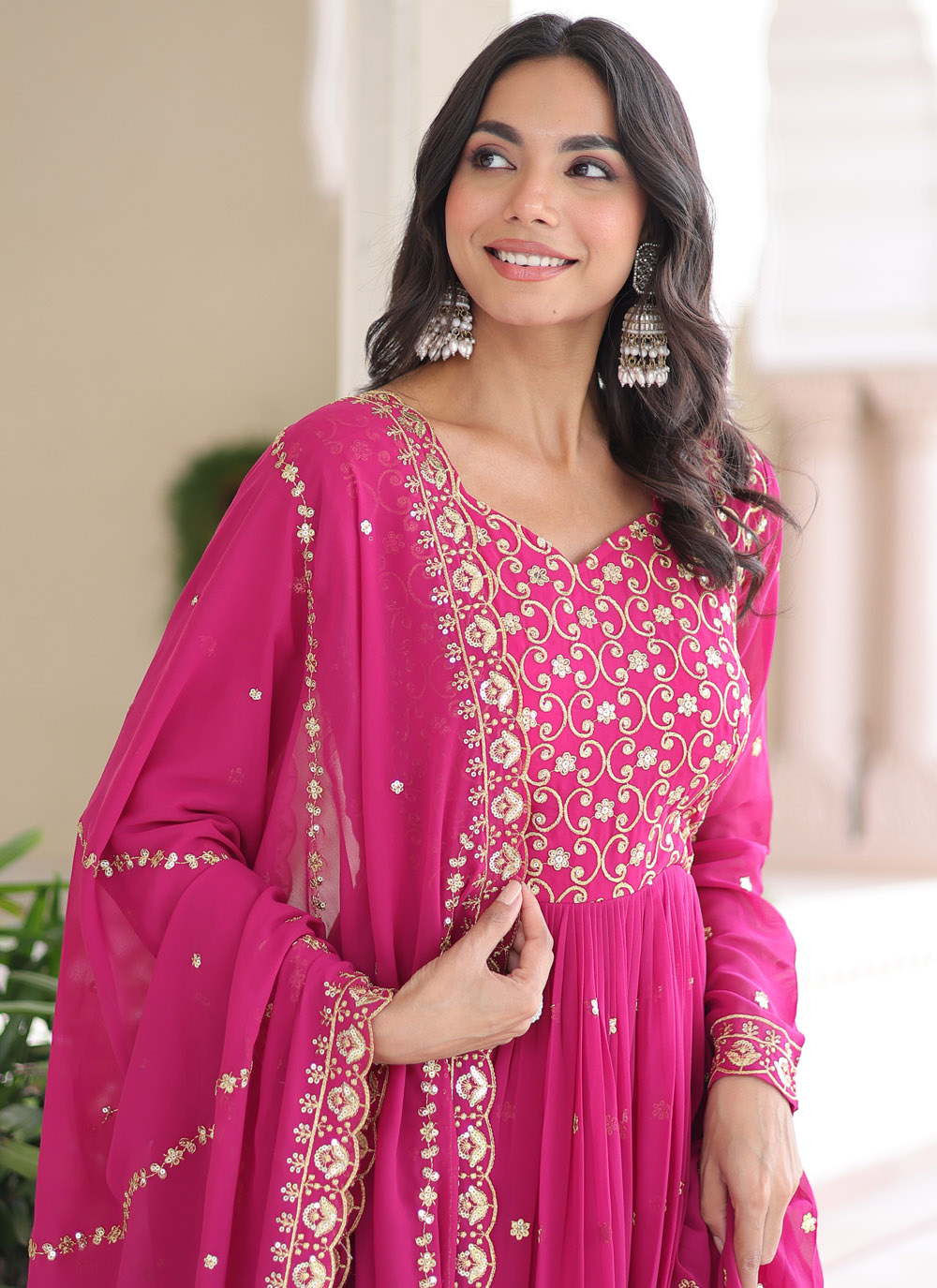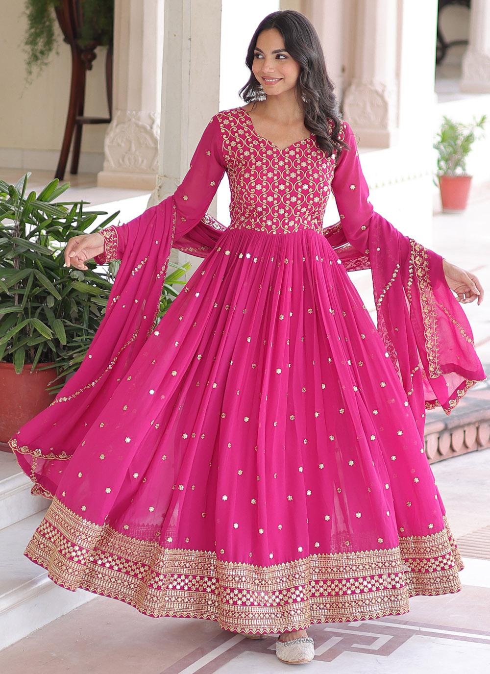 Designed for modern festive wear, this pink readymade gown features rich sequin and zari detailing across its smooth georgette fabric. Lightweight, stylish and comfortable, it’s ideal for events that demand effortless glamour. Comes with matching dupatta.