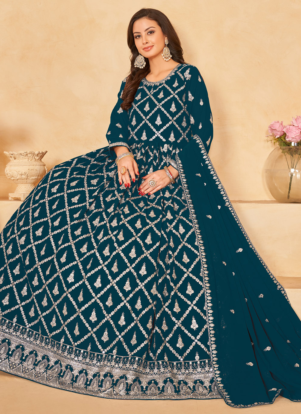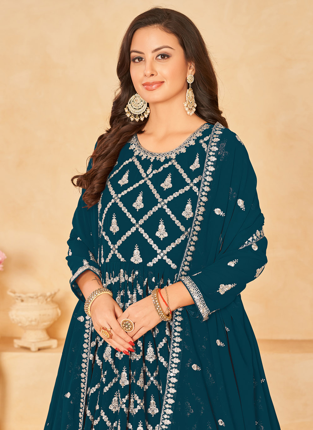 This embroidered faux georgette salwar suit in a rich teal hue is perfect for the modern woman who loves ethnic fashion with a contemporary touch. The elegant embroidery and fluid silhouette make it a great pick for festivals, get-togethers or family events. Comes with matching bottom and dupatta.