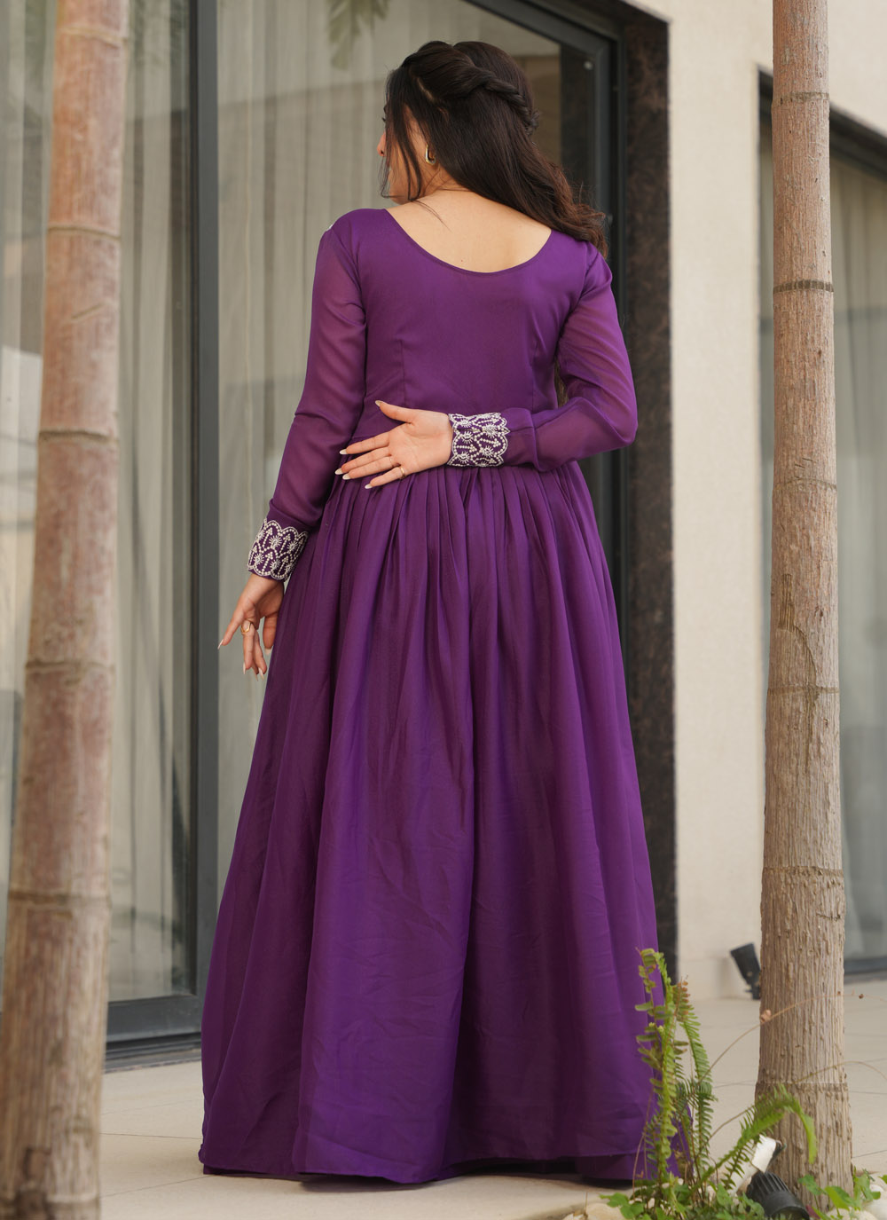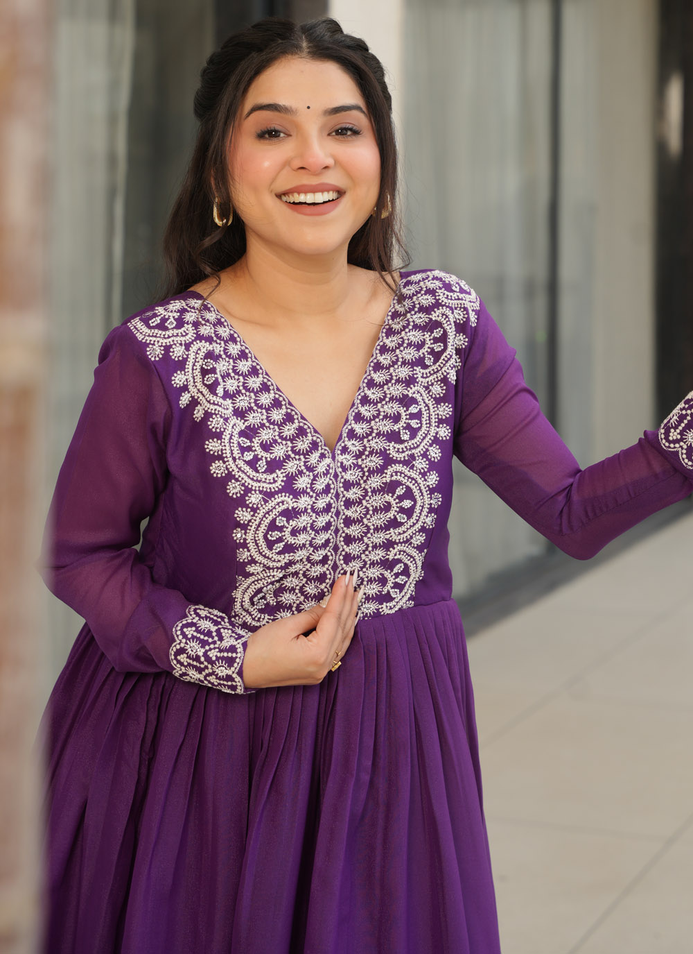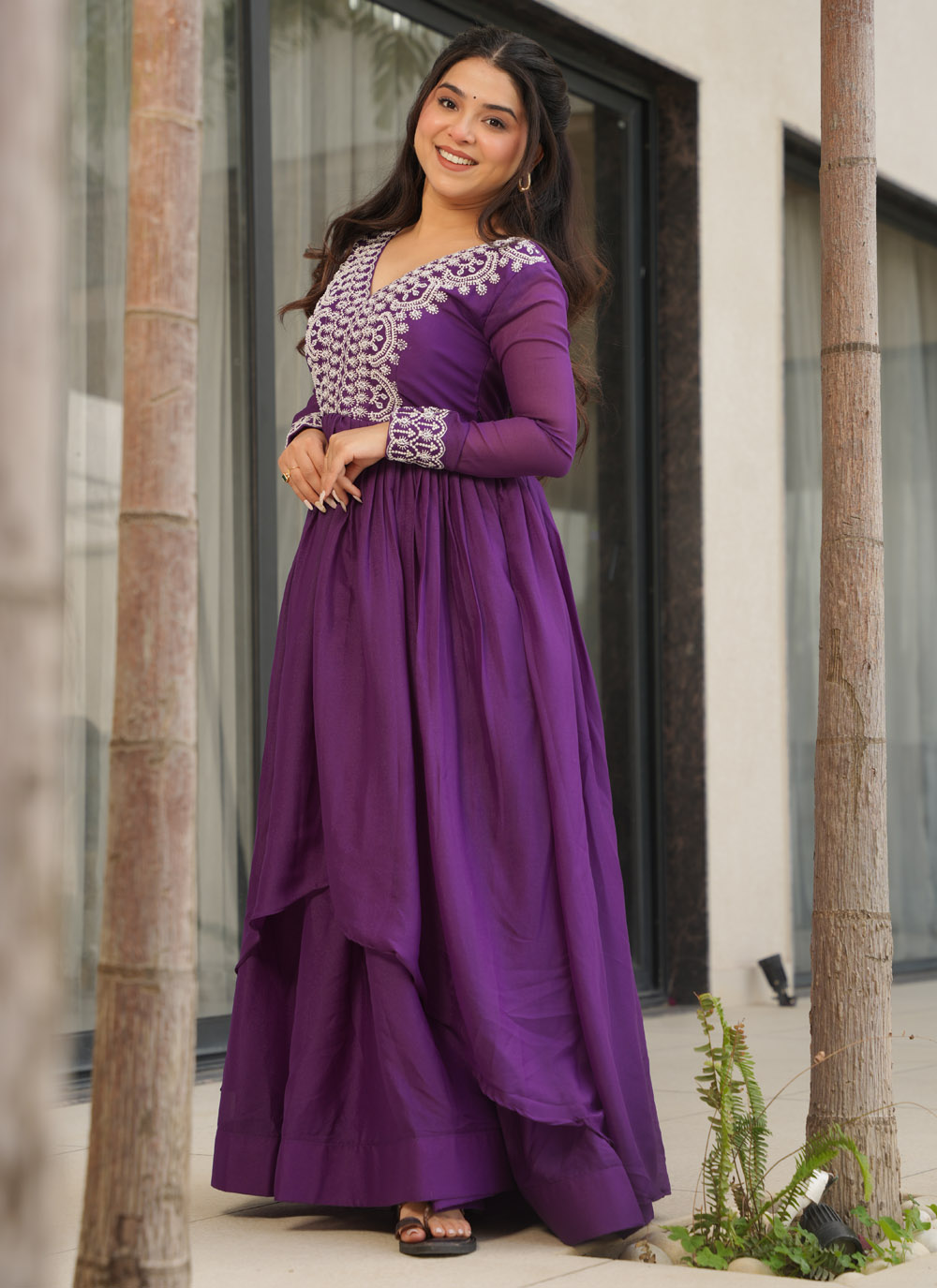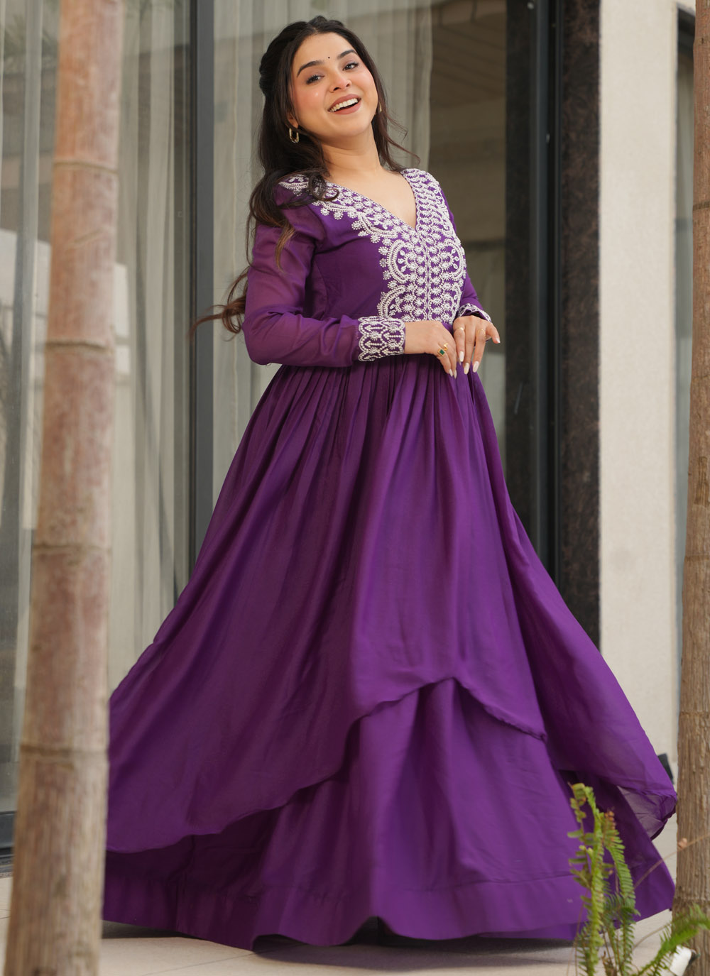 Designed for the modern woman with a love for timeless elegance, this purple layered gown features delicate embroidery that adds a touch of luxury. The lightweight georgette fabric drapes gracefully, offering comfort and style for special celebrations.