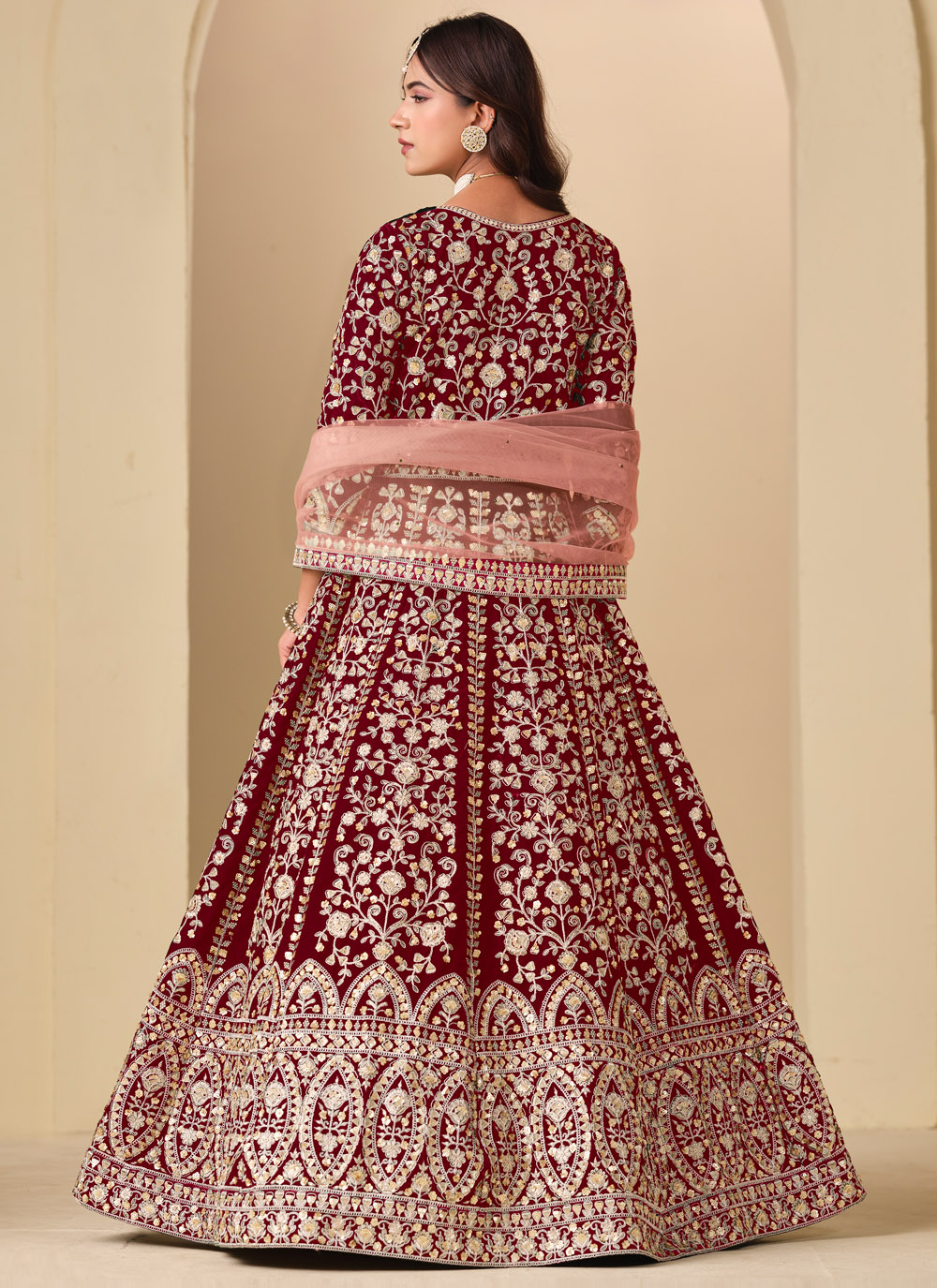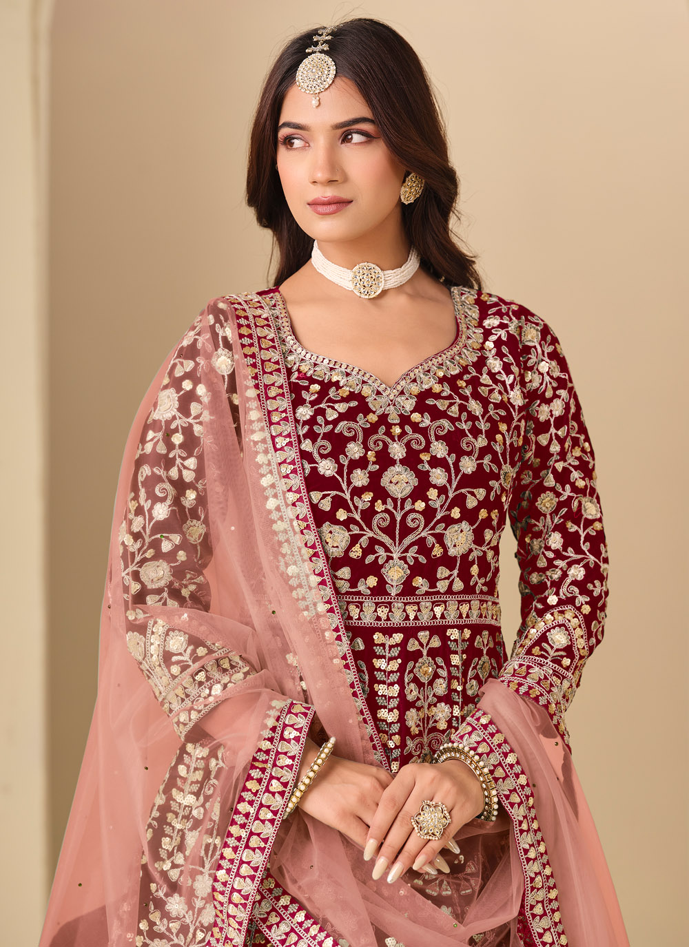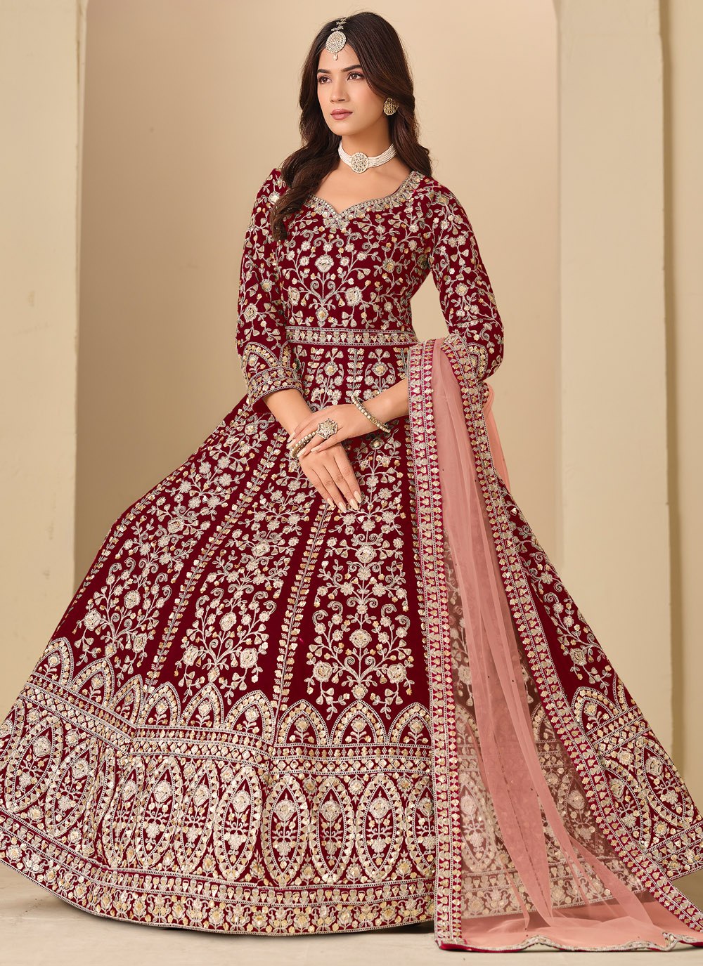 Designed for modern ethnic wear, this embroidered maroon Anarkali salwar kameez offers a rich feel with its soft velvet texture. The flowing silhouette and detailed embroidery make it perfect for grand occasions. Comes with matching bottom and dupatta.