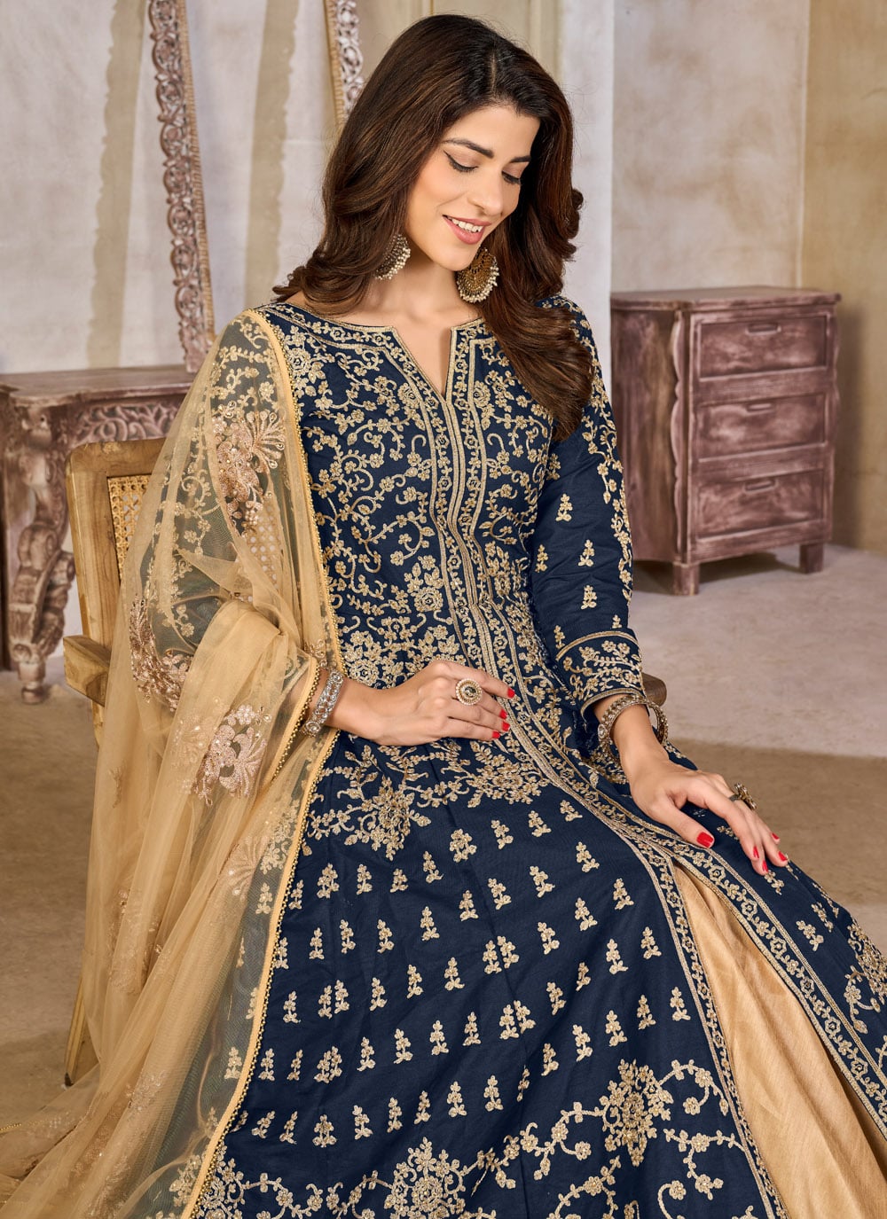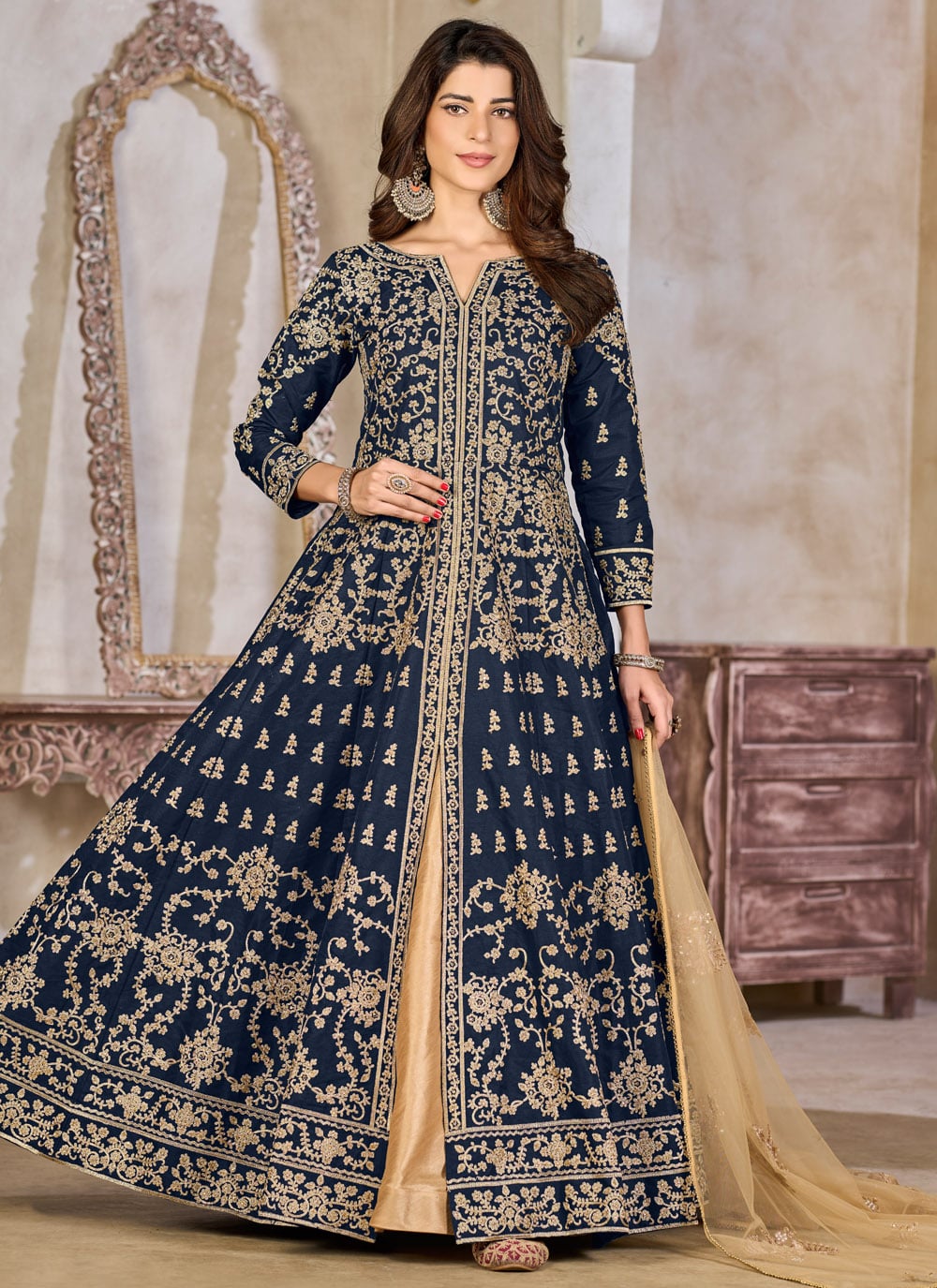 This navy blue art silk Anarkali style salwar kameez reflects timeless artistry with delicate zari embroidery. The graceful flare adds a majestic vibe, while the glossy fabric makes it look effortlessly rich. Comes with matching bottom and dupatta.