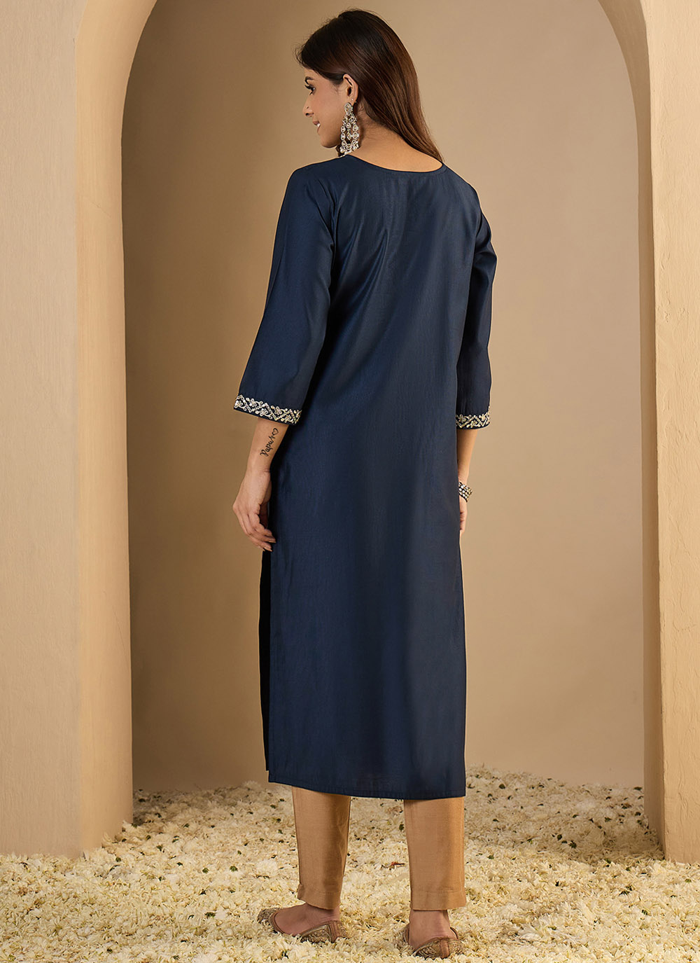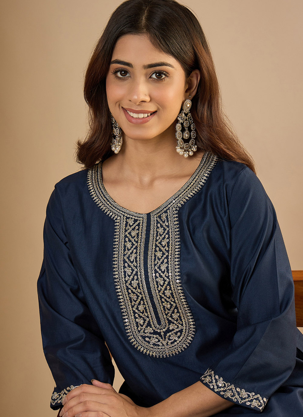 This navy blue embroidered silk blend kurti offers a perfect balance of comfort and designer elegance. The stylish embroidery adds richness, while the smooth silk blend fabric provides a flattering and comfortable fit.
