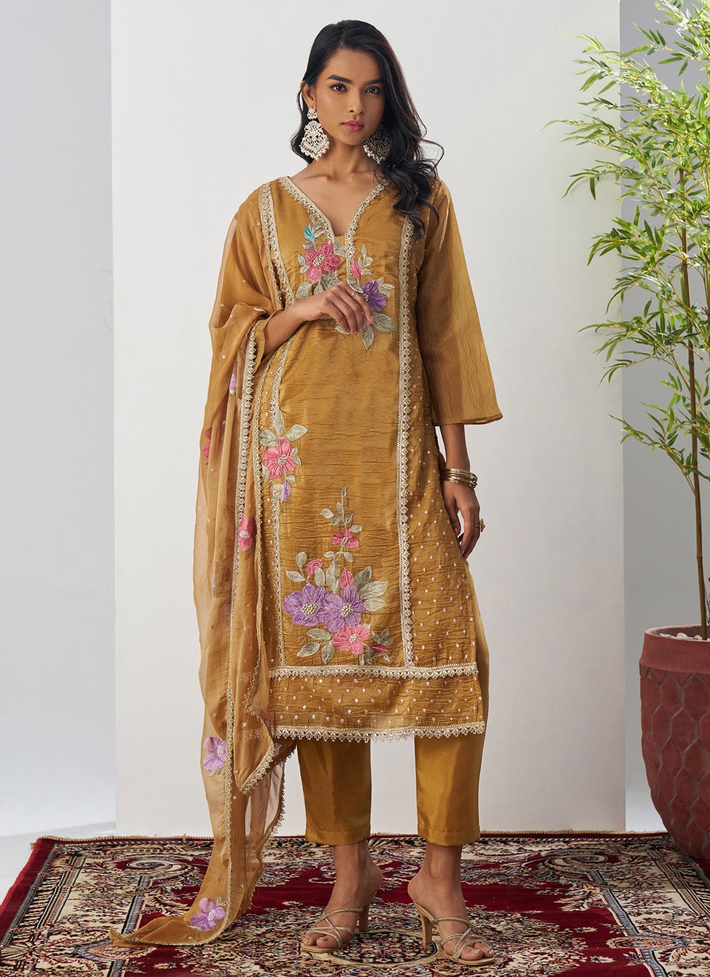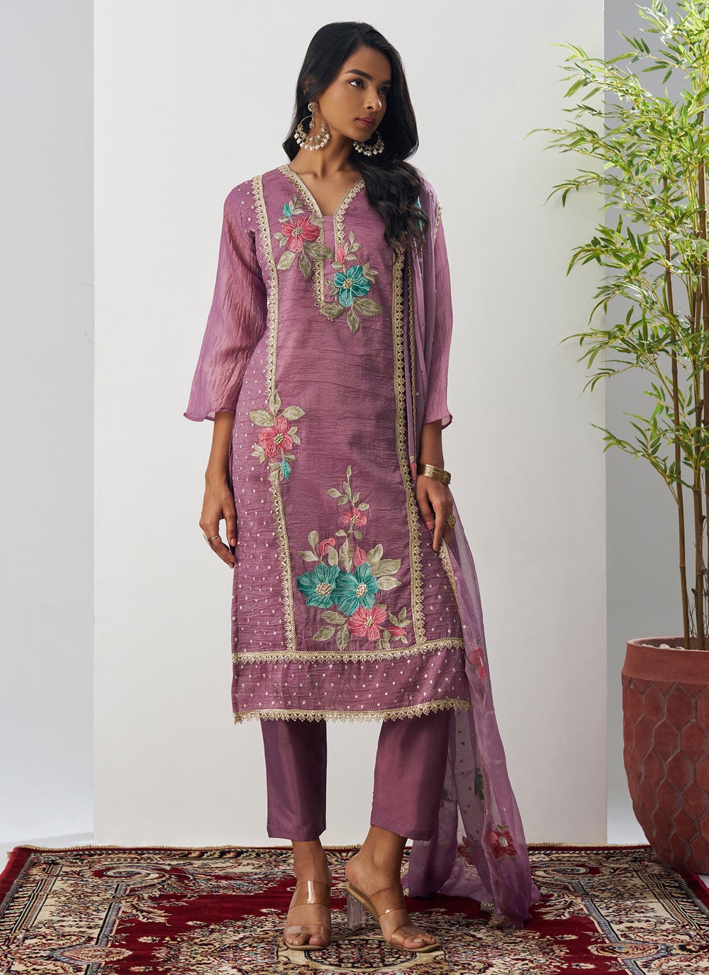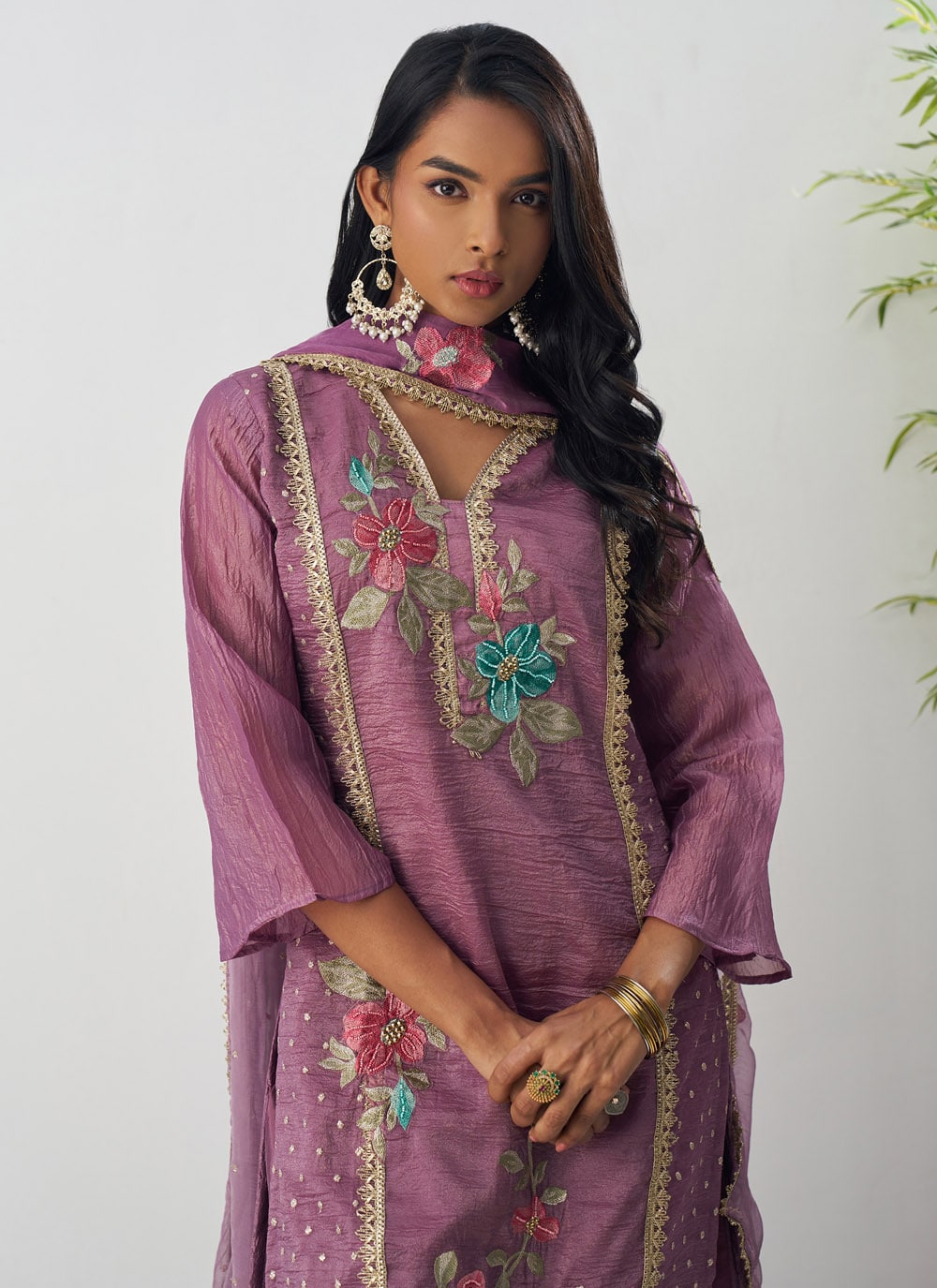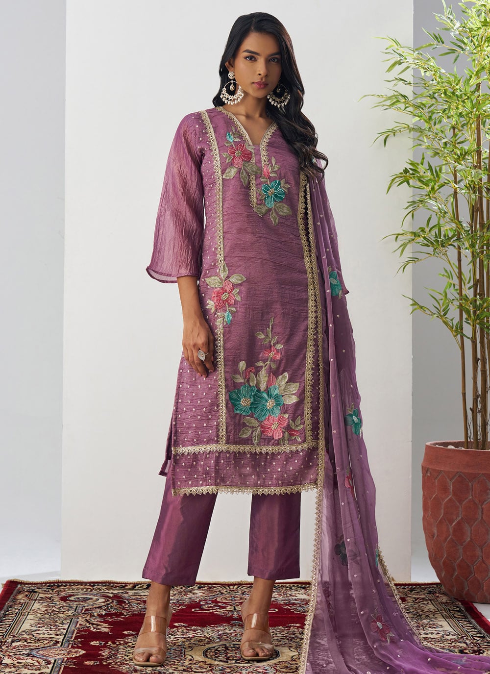 Make a statement in elegance with this readymade purple salwar kameez. The soft crush fabric flows effortlessly, while the delicate embroidery adds a touch of regal charm. Comes with matching bottom and dupatta.