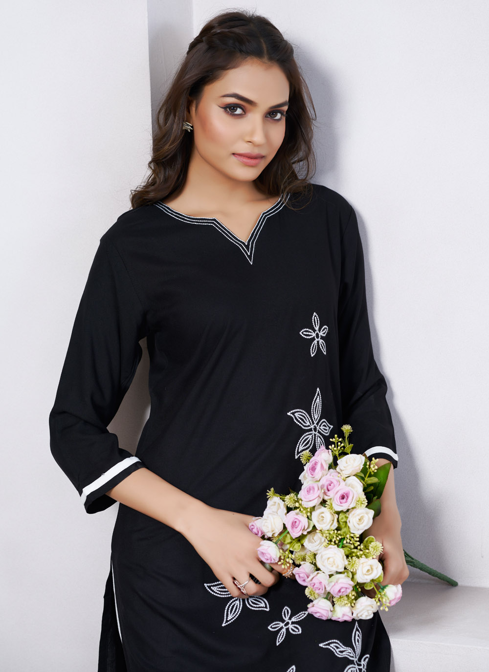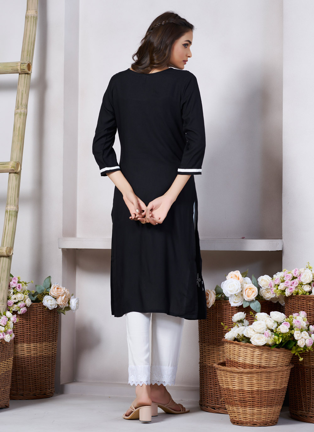 Turn heads in this stunning Black Embroidered Kurti made from soft rayon. Designed for party wear, it features intricate threadwork that adds a rich ethnic appeal.