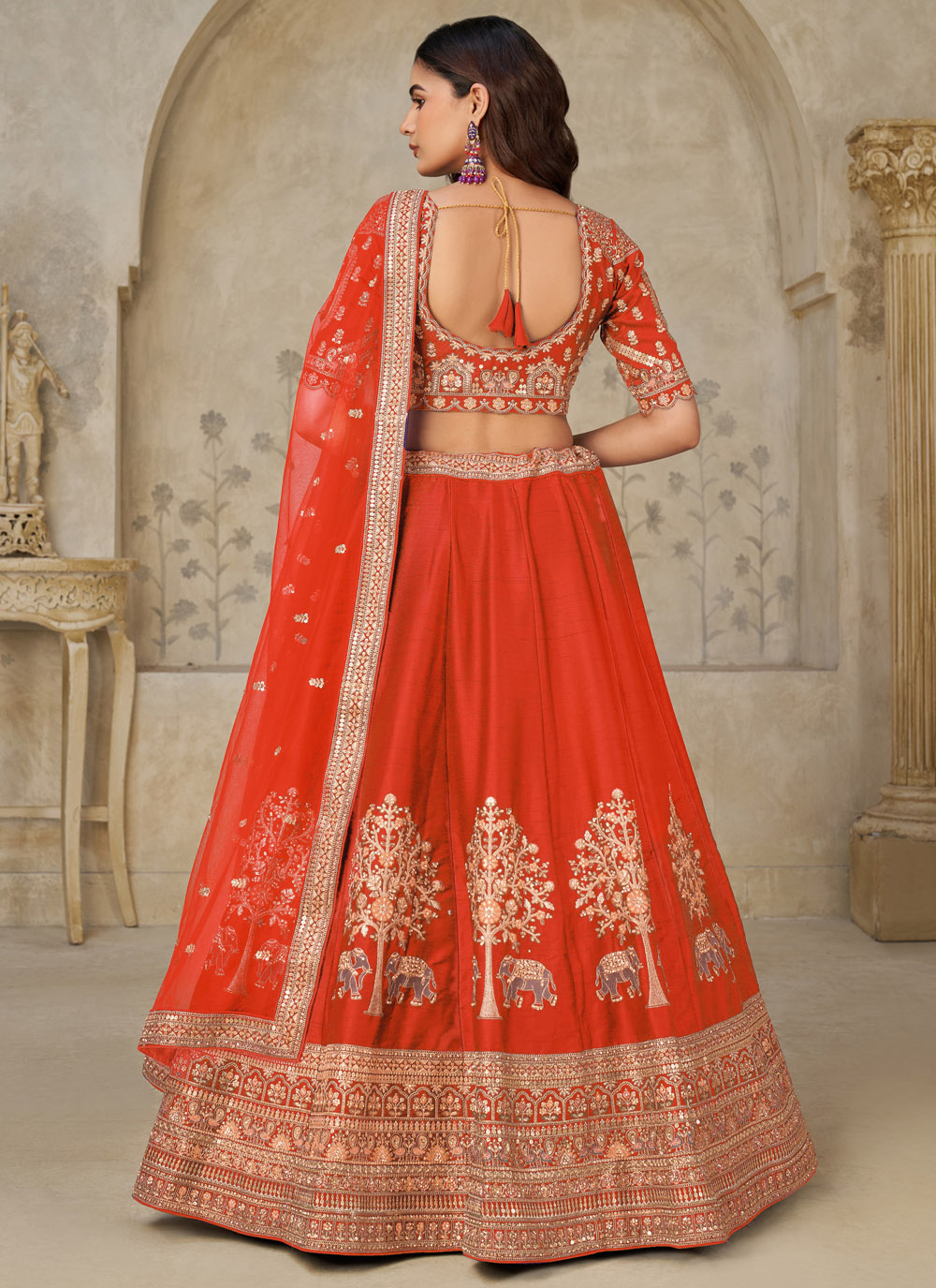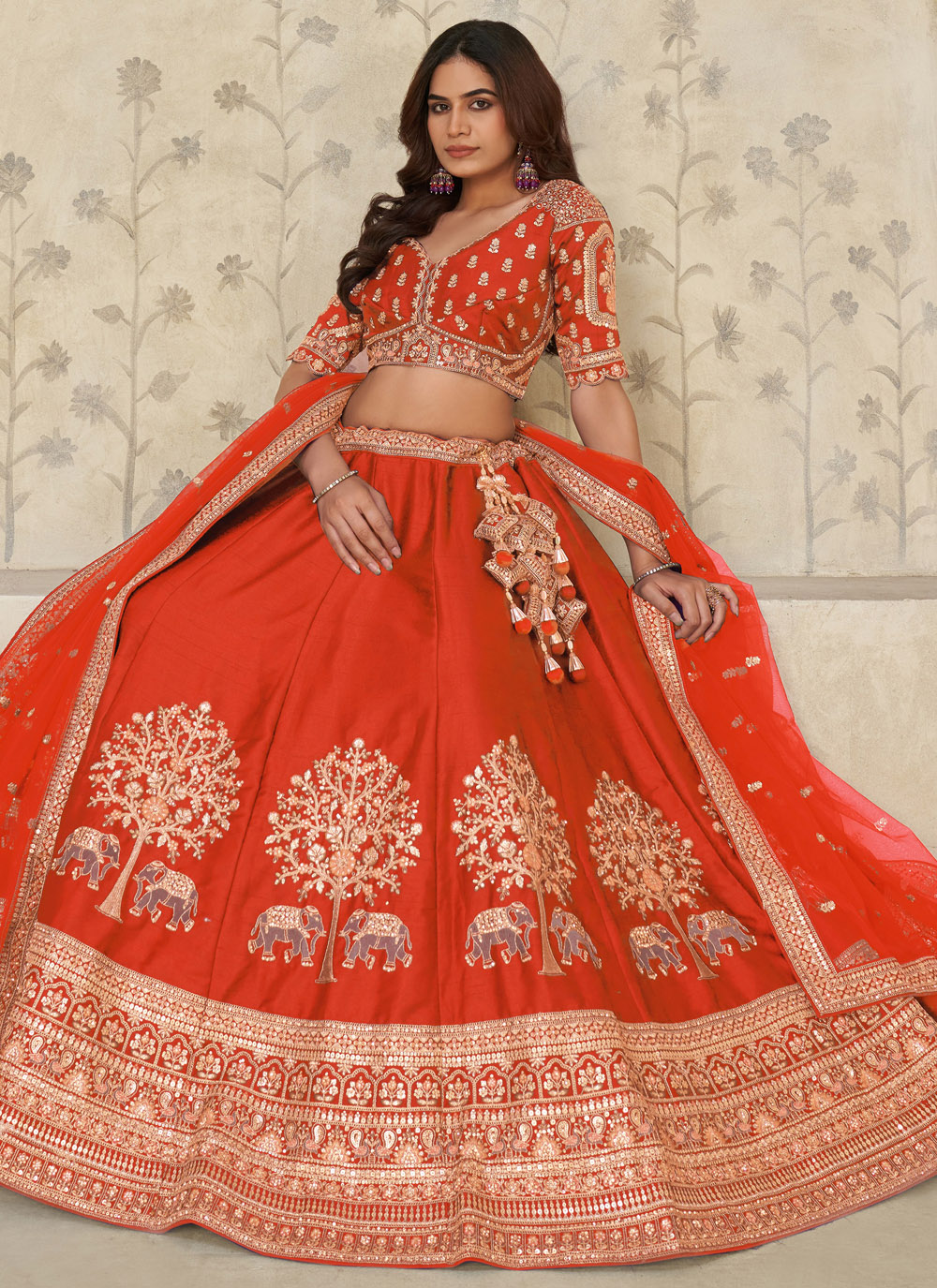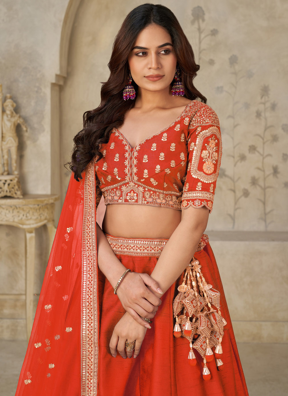 This designer rust silk lehenga choli offers a beautiful mix of classic embroidery and contemporary flair. The sequins and stone work enhance the zari detailing, giving you a graceful reception look that stands out effortlessly. Comes with matching choli and dupatta.